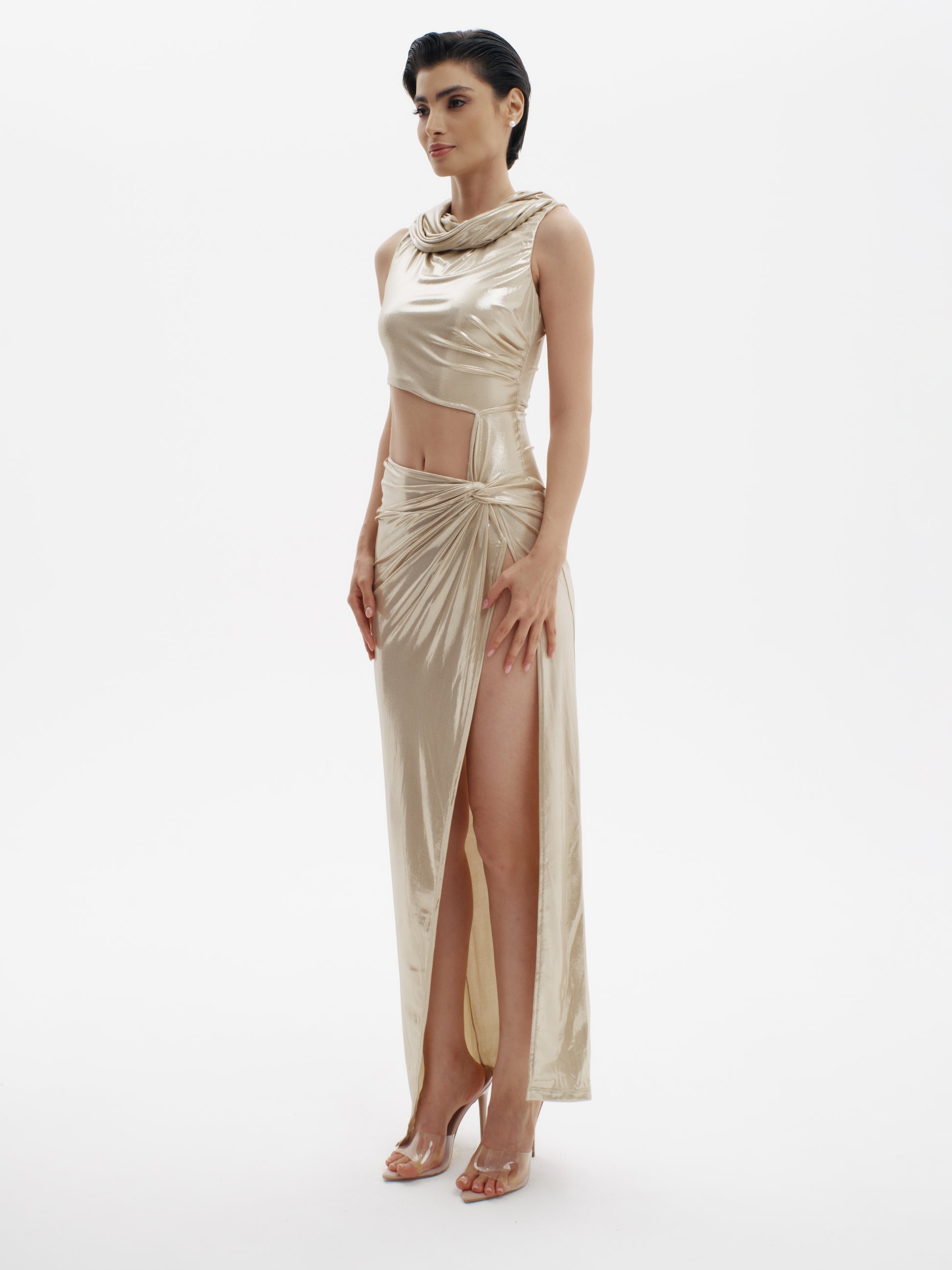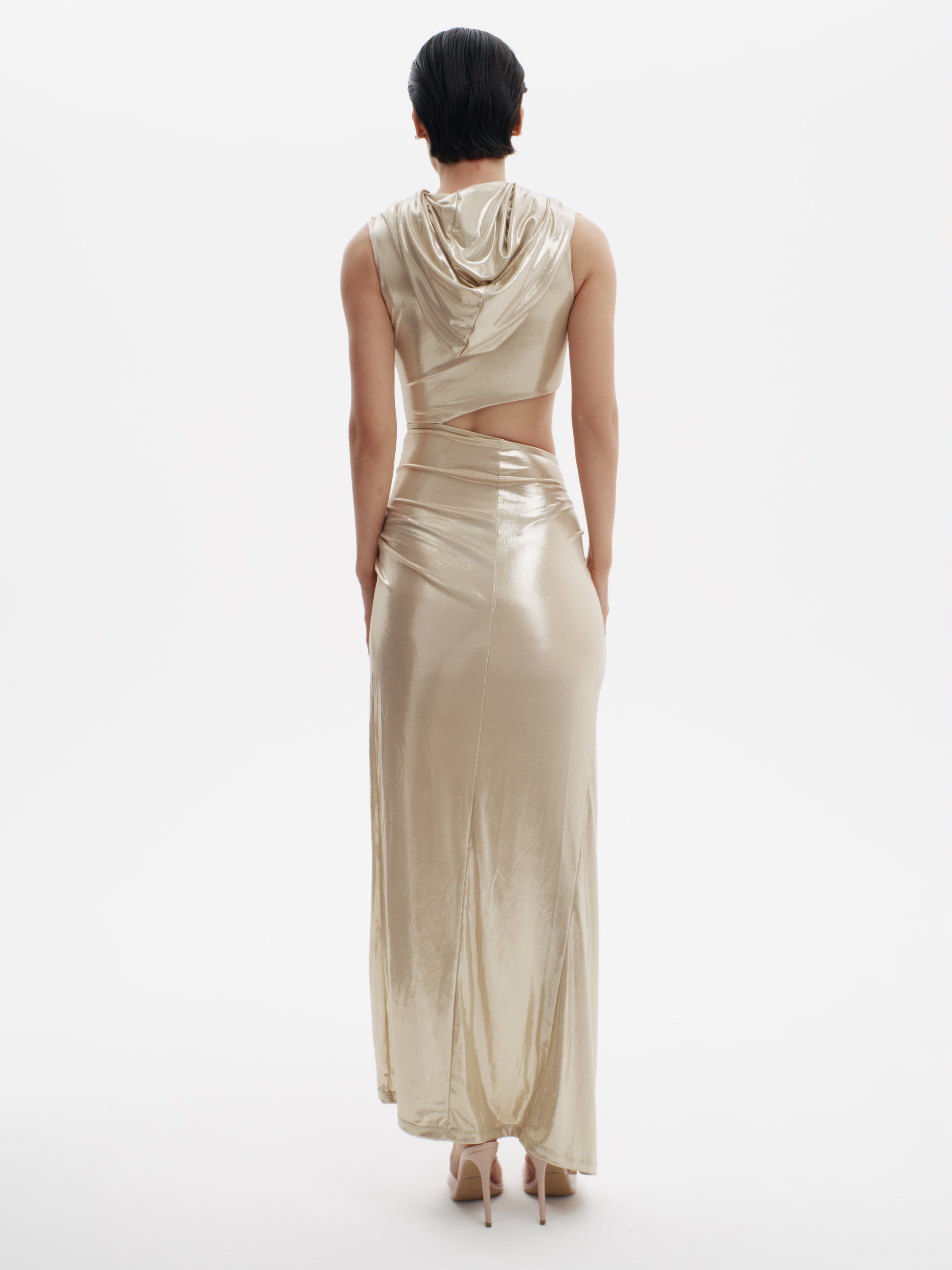 Because “no” was never an option—the Asked Anyway Hoodie Dress transforms sporty comfort into night-out glamour. A cropped hooded bodice meets a draped high-slit skirt in lustrous stretch jersey, merging athletic edge with sultry movement. Rooftop cocktails or after-hours adventures, this look says watch me.