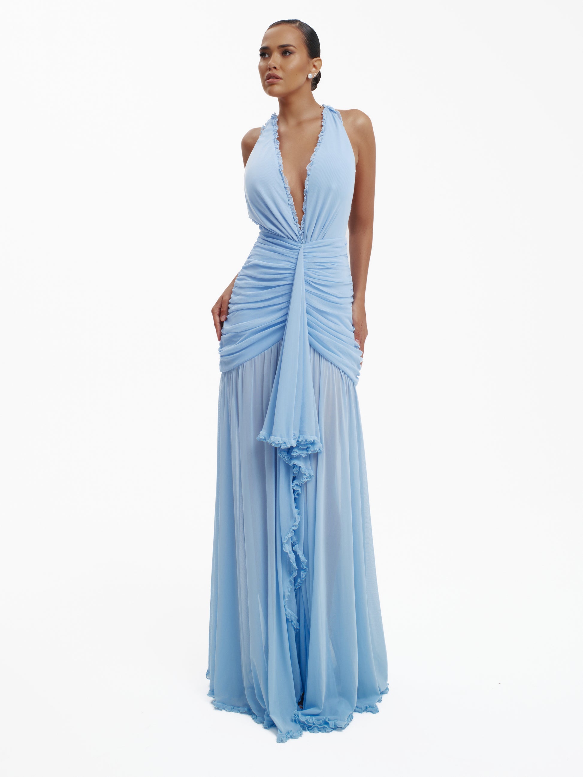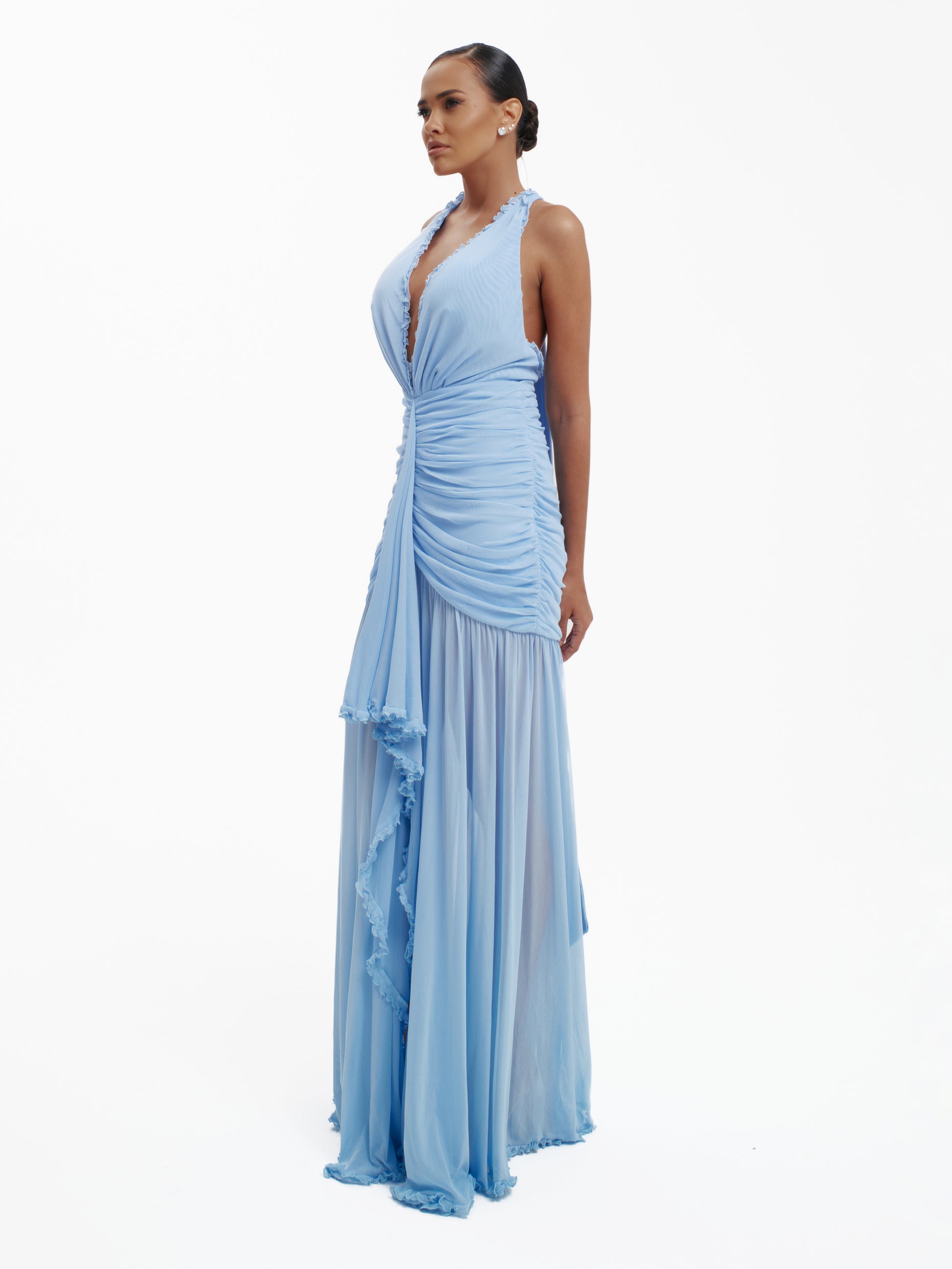 Make an unforgettable entrance with the Bare Minimum Mermaid Dress, featuring a dramatic plunge neckline and ruched bodice. Crafted from luxurious stretch mesh, it offers a contoured fit with cascading ruffles and a striking mermaid-style train.