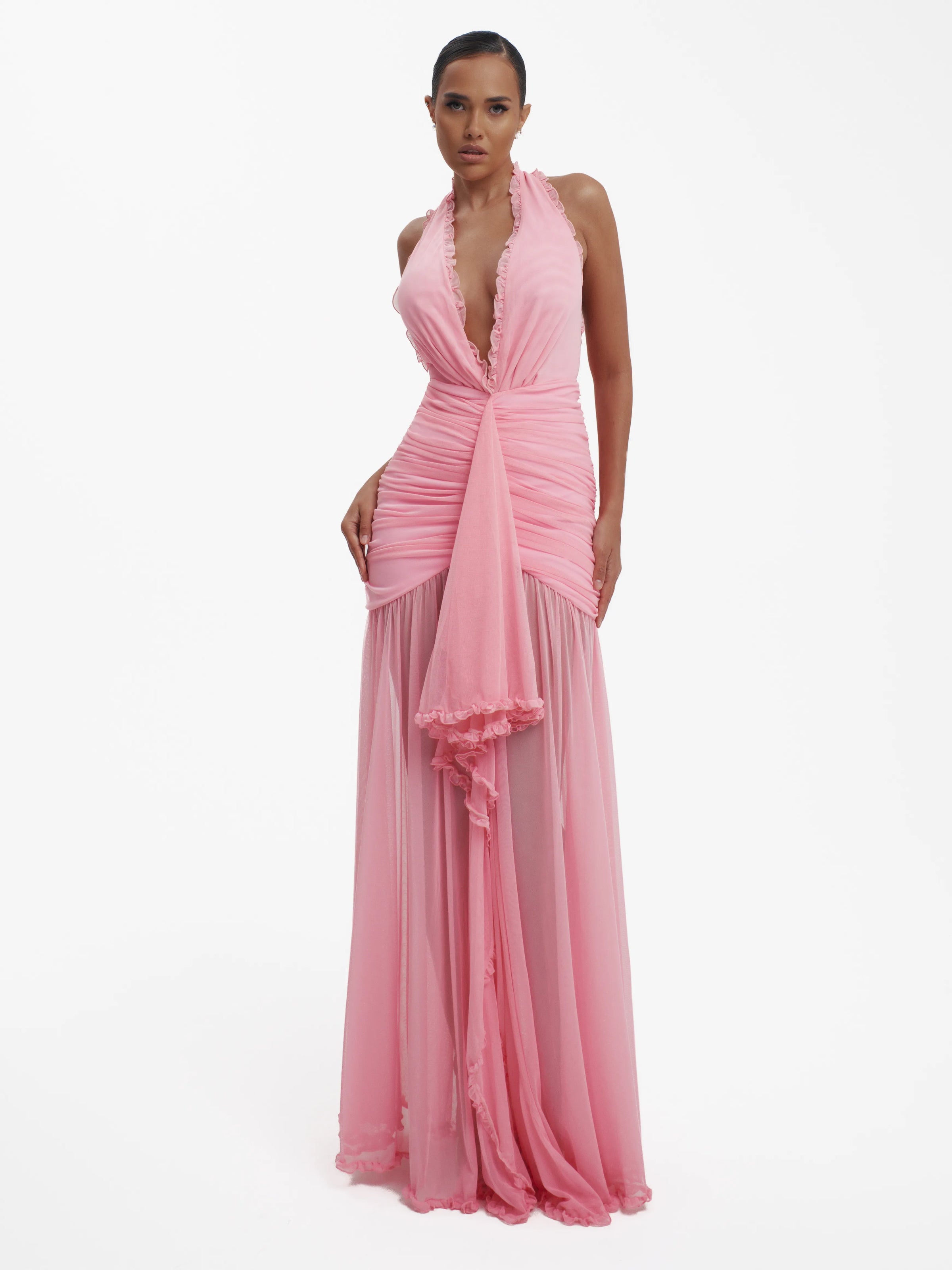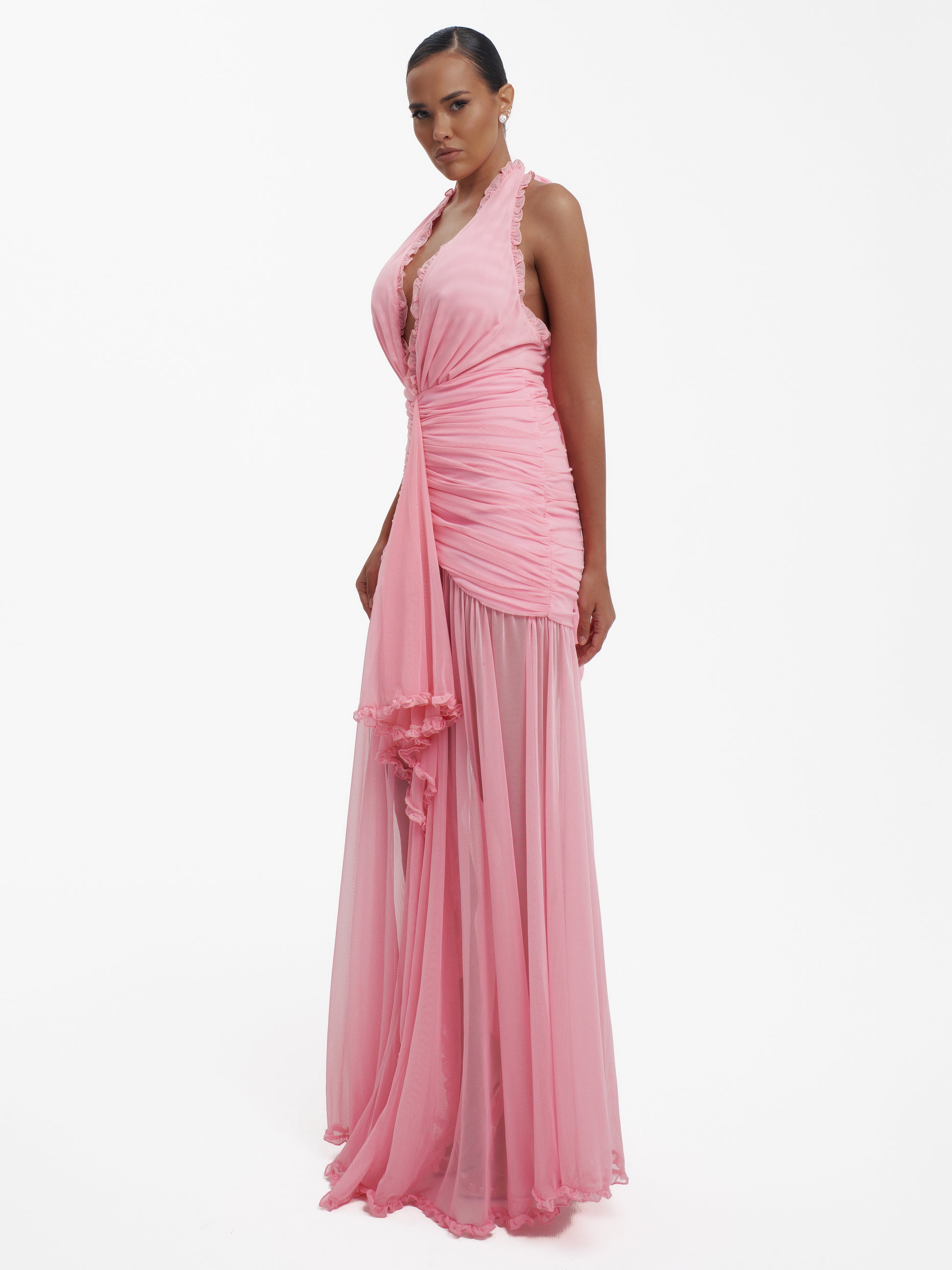 Make an unforgettable entrance with the Bare Minimum Mermaid Dress, featuring a dramatic plunge neckline and ruched bodice. Crafted from luxurious stretch mesh, it offers a contoured fit with cascading ruffles and a striking mermaid-style train.