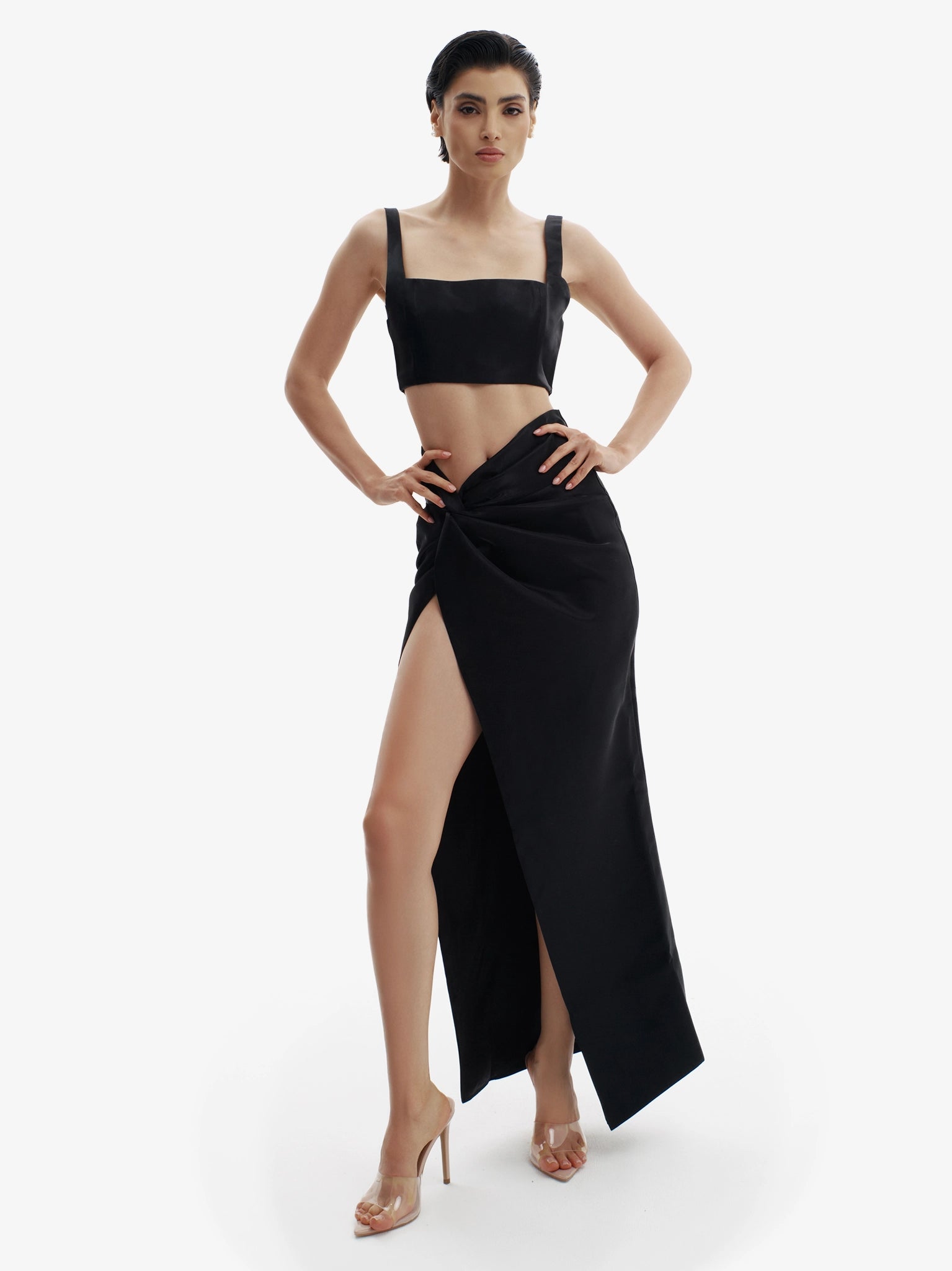 Your instant shot of style energy—the Espresso Yourself Set delivers the perfect morning pick-me-up. The cropped First Coffee Top balances a sleek, straight neckline with just the right touch of structure, while the flowing Slip Decision Skirt glides effortlessly from early plans to late-night detours. Together they create a look that’s confident, polished, and always ready for whatever’s brewing next.