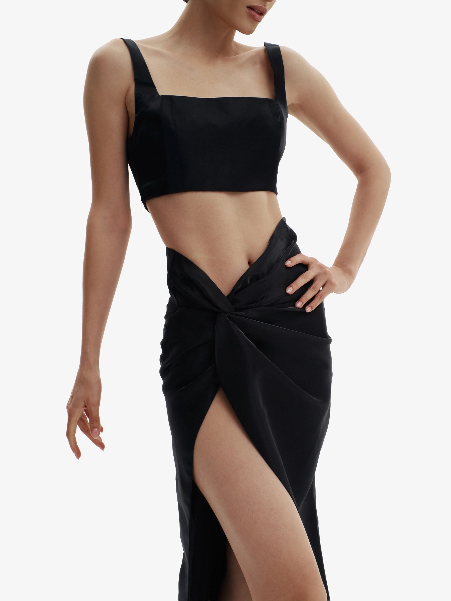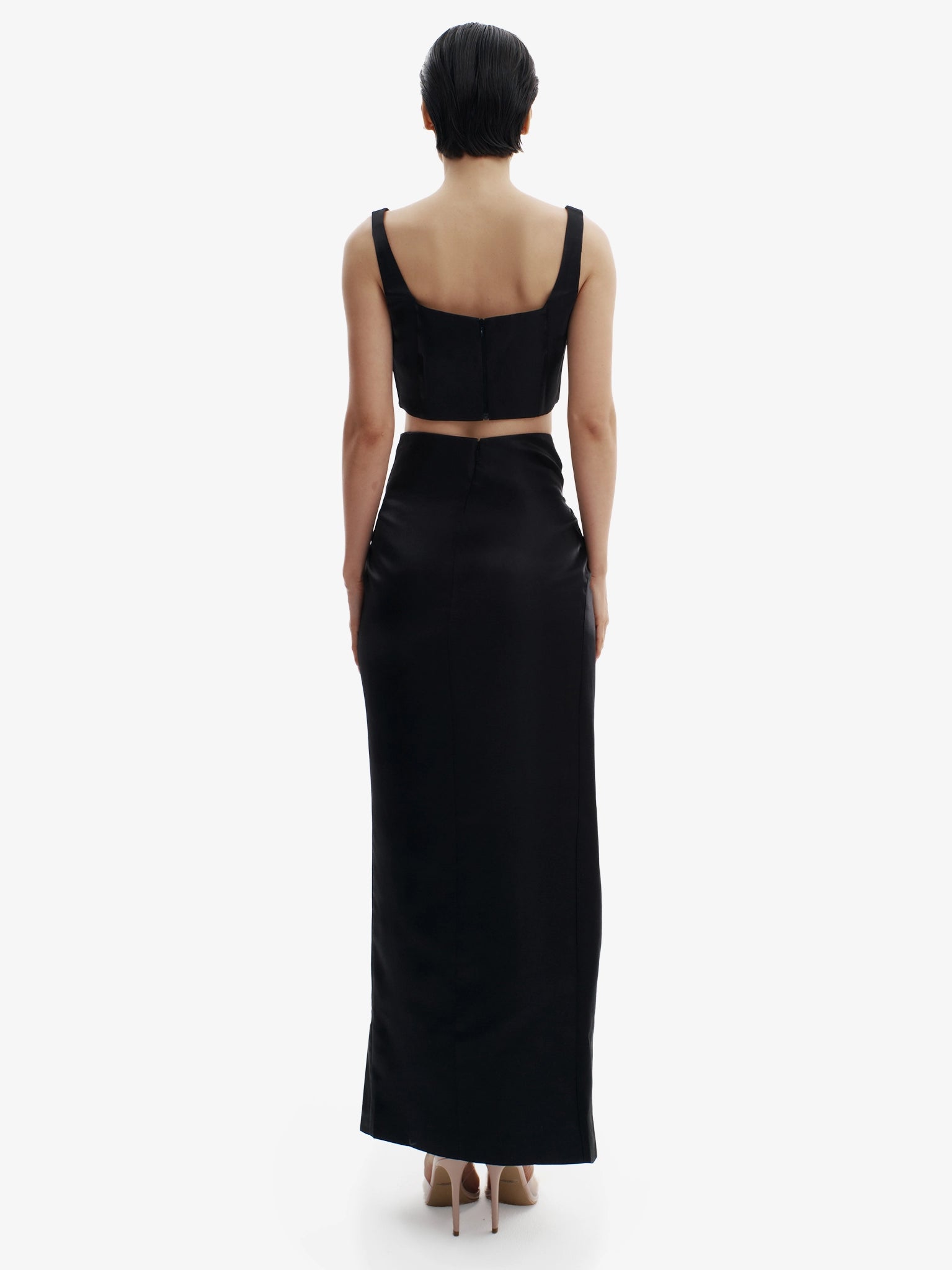 Model is 173 cm / 5’8” and wears size XS. Top is slim and body-hugging; skirt features a straight, elongating cut with fluid movement. Take your usual size for a tailored yet comfortable fit.