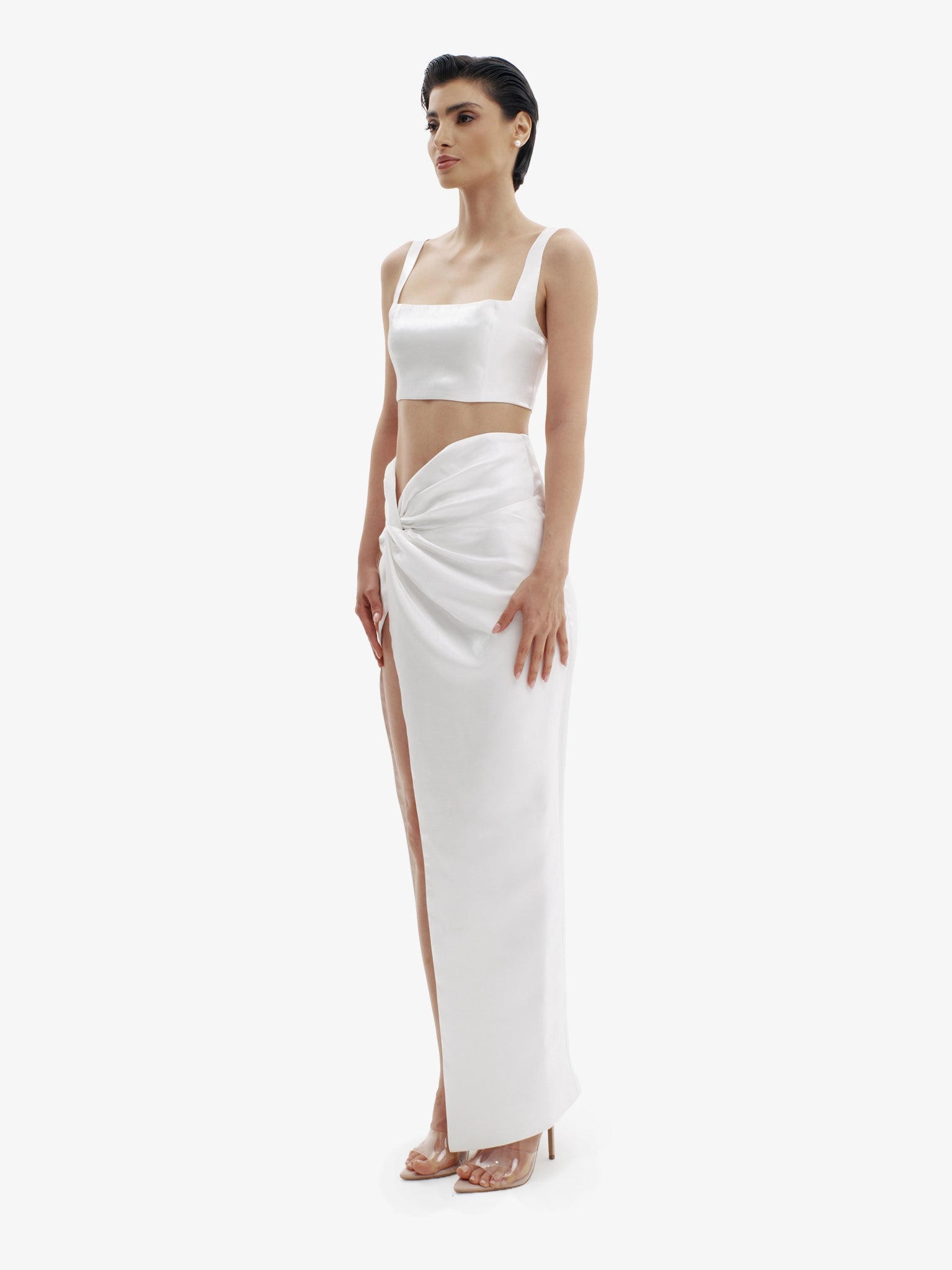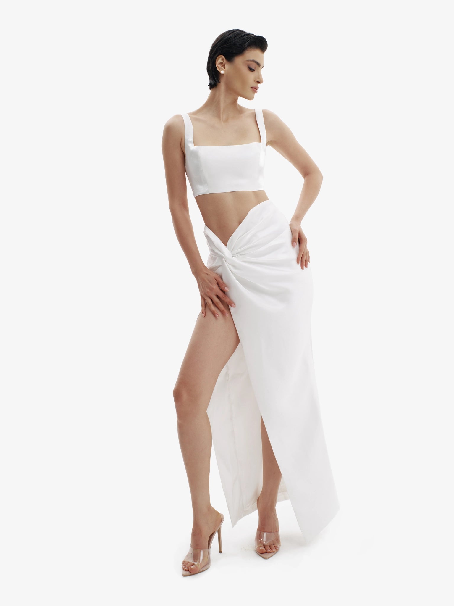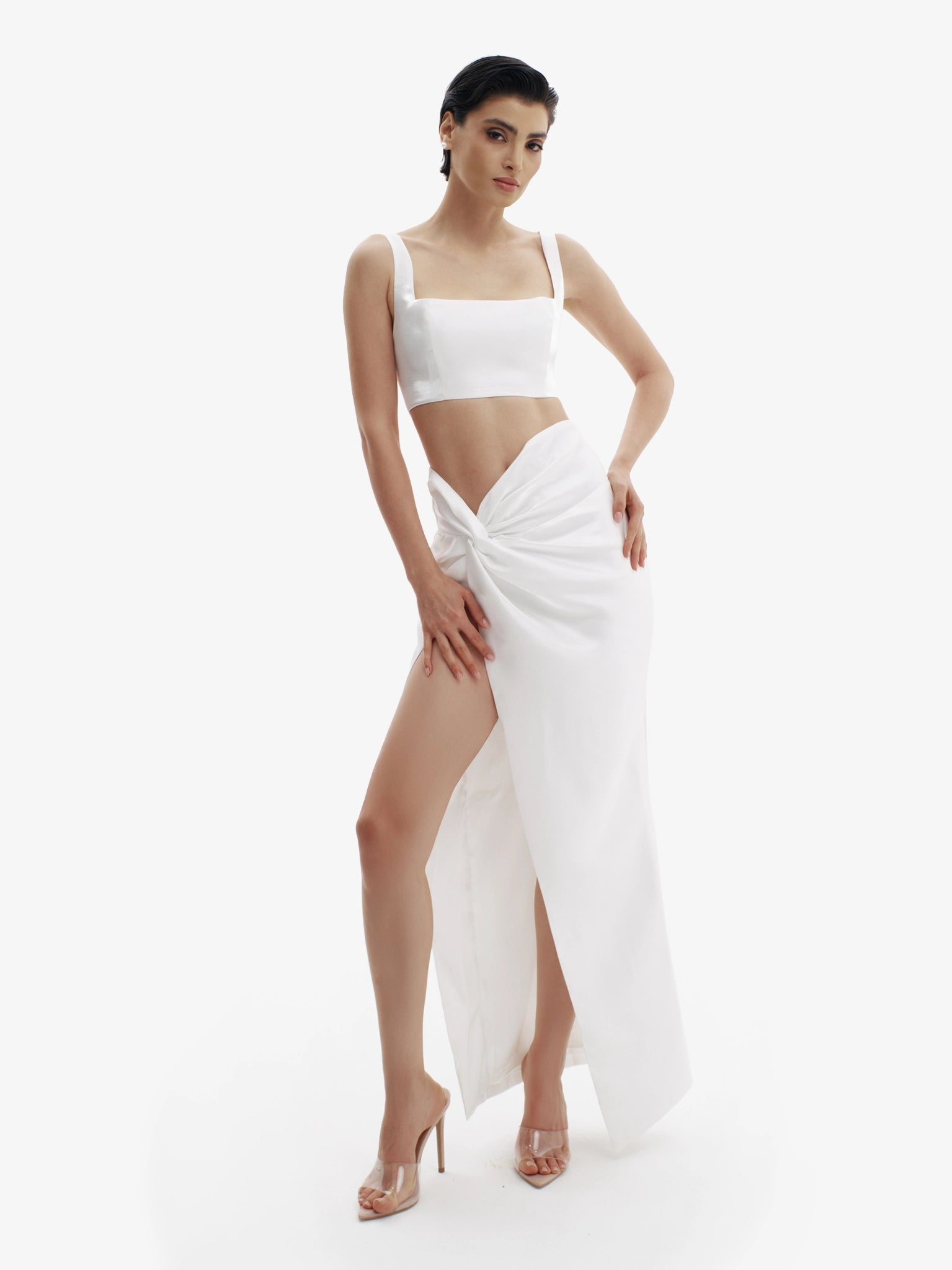 Model is 173 cm / 5’8” and wears size XS. Top is slim and body-hugging; skirt features a straight, elongating cut with fluid movement. Take your usual size for a tailored yet comfortable fit.