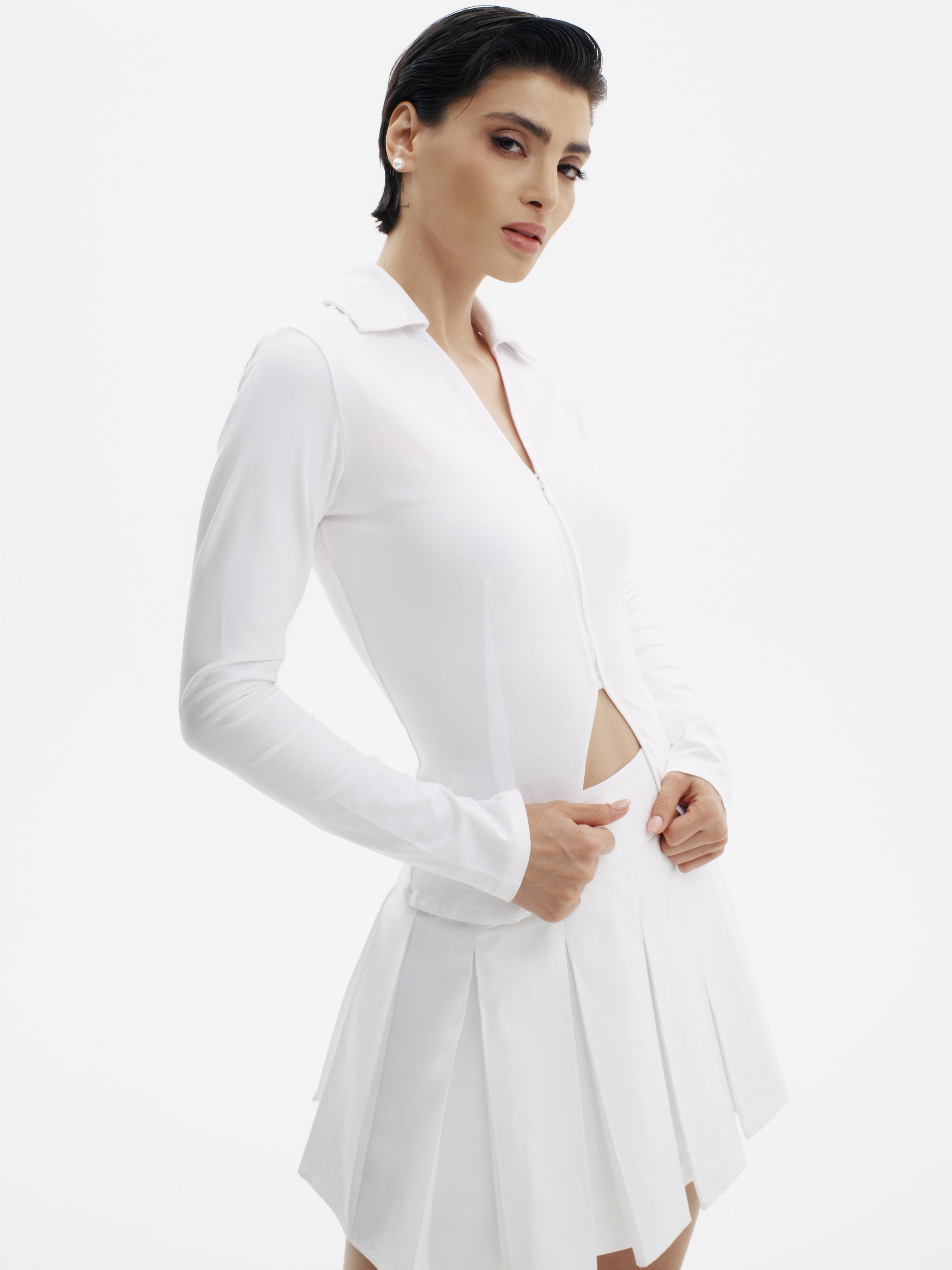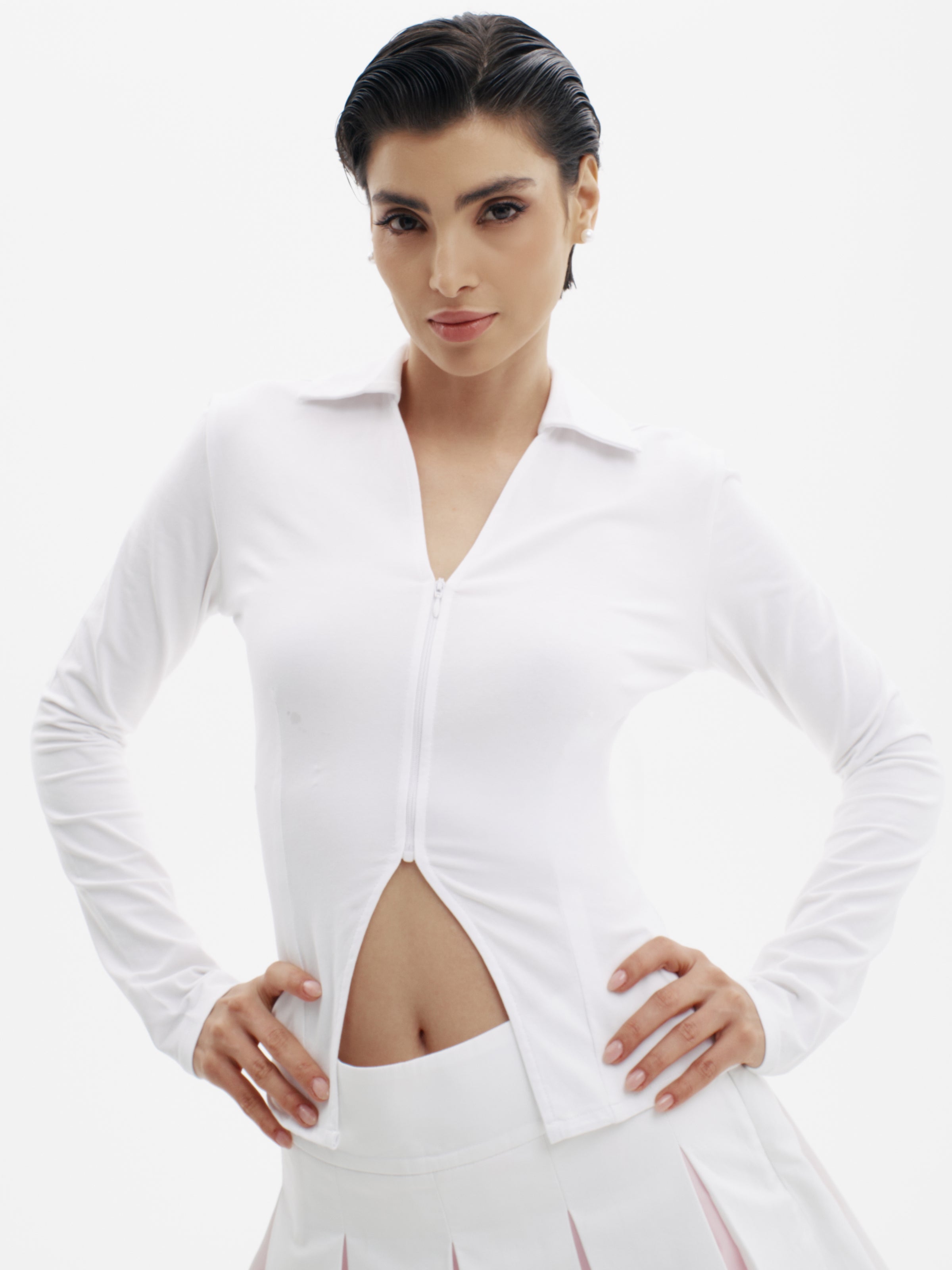 Serving style every time—the Game Point Top blends sporty lines with effortless polish. This fitted, collared long-sleeve features a subtle V-cut neckline and is crafted from soft cotton-spandex for just the right amount of stretch. Its streamlined shape makes it a versatile piece you can dress up with tailored trousers, pair with denim for a casual look, or match with the Match Maker Skirt for a coordinated win.