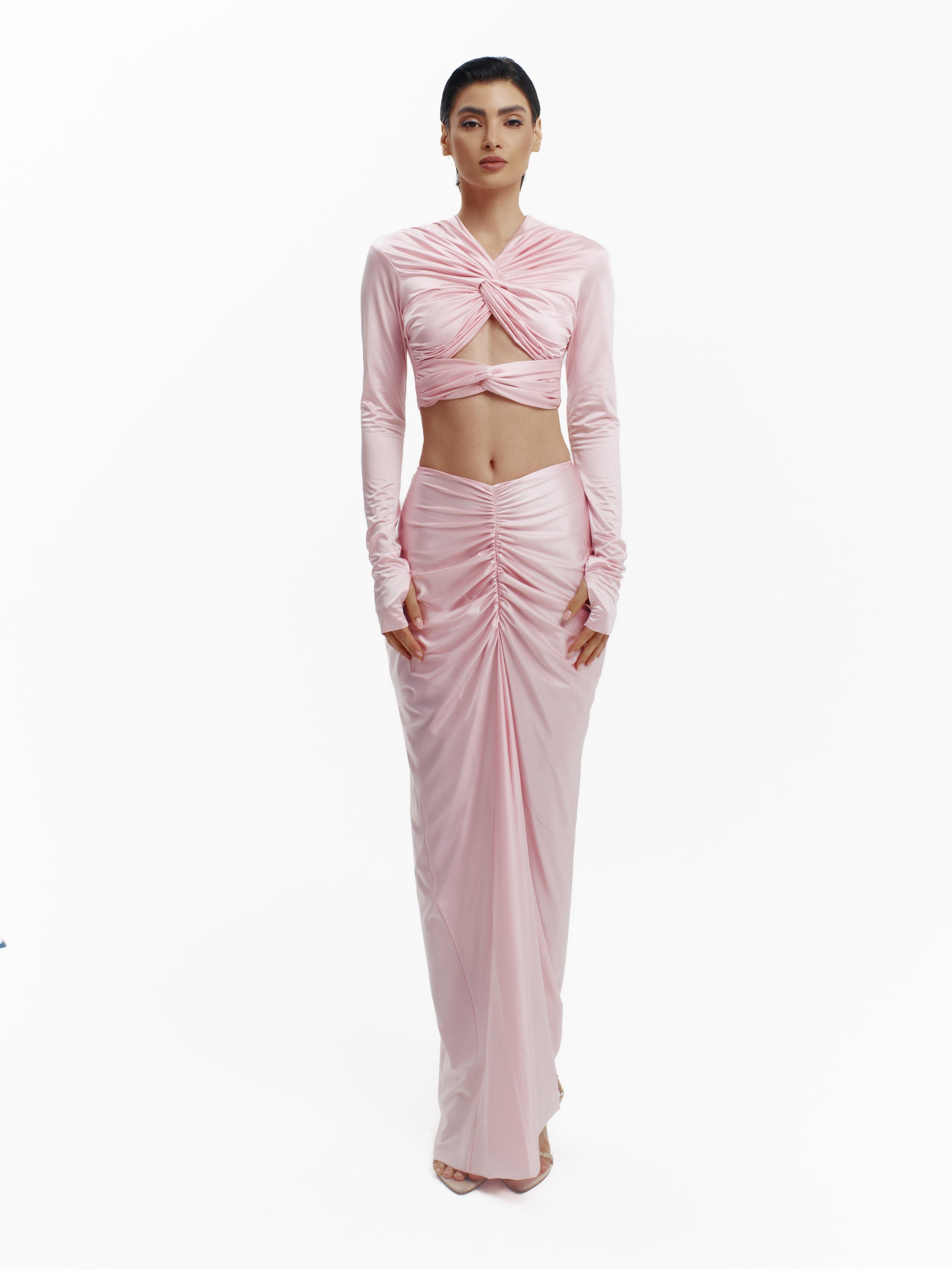 Confident, sleek, and playfully bold—the Low & Twisted Set pairs a statement crop with a curve-hugging skirt for head-turning impact. The Twist Knot Crop Top features a knotted bust and keyhole cut-out for sculpted allure, while full-length sleeves balance the cropped fit. The High-Waisted Draped Skirt celebrates every curve with artful ruching and a fluid, body-skimming silhouette. Crafted from soft stretch jersey, both pieces move with you and catch the light with a subtle sheen for effortless glam from day to night.