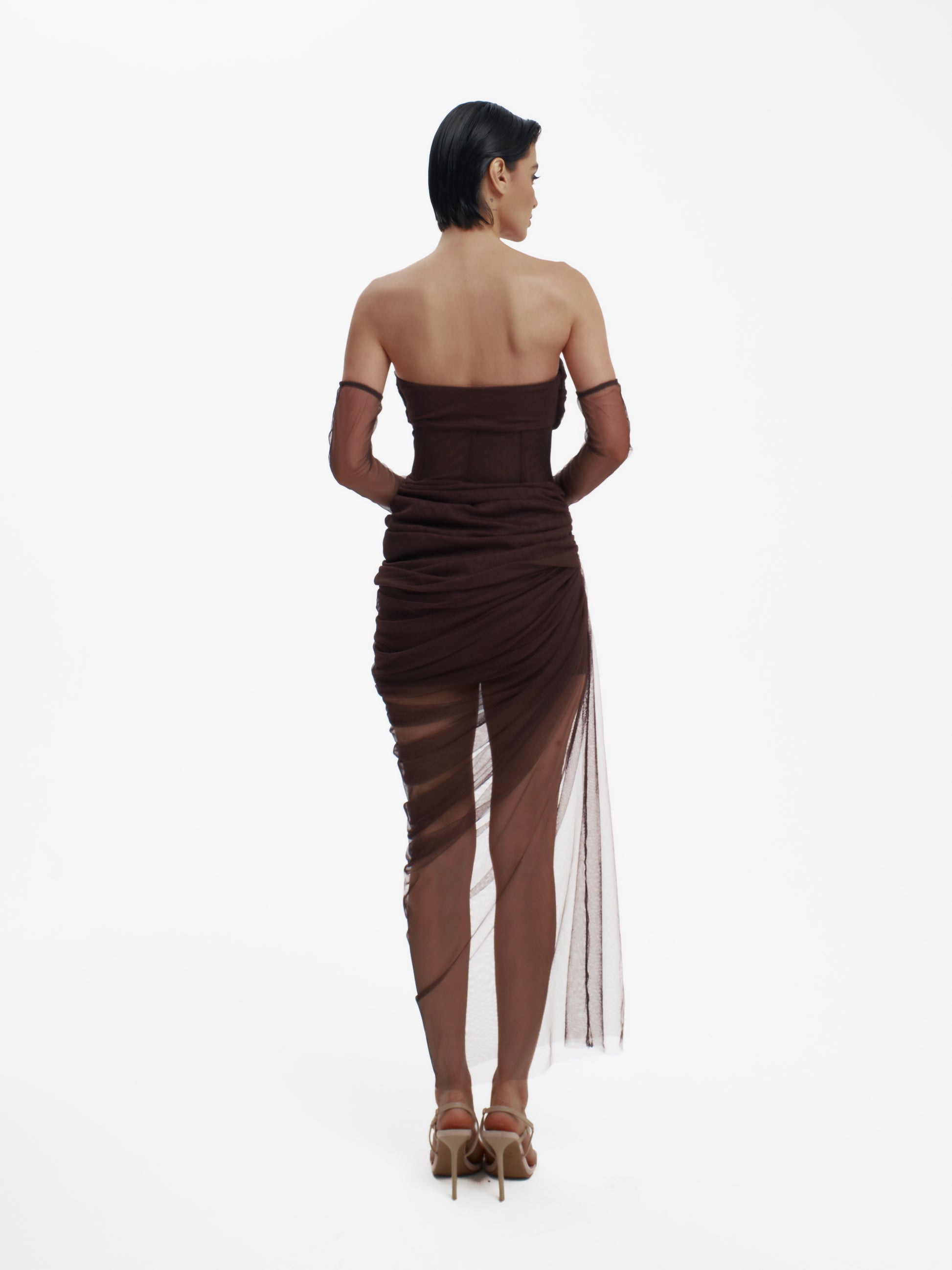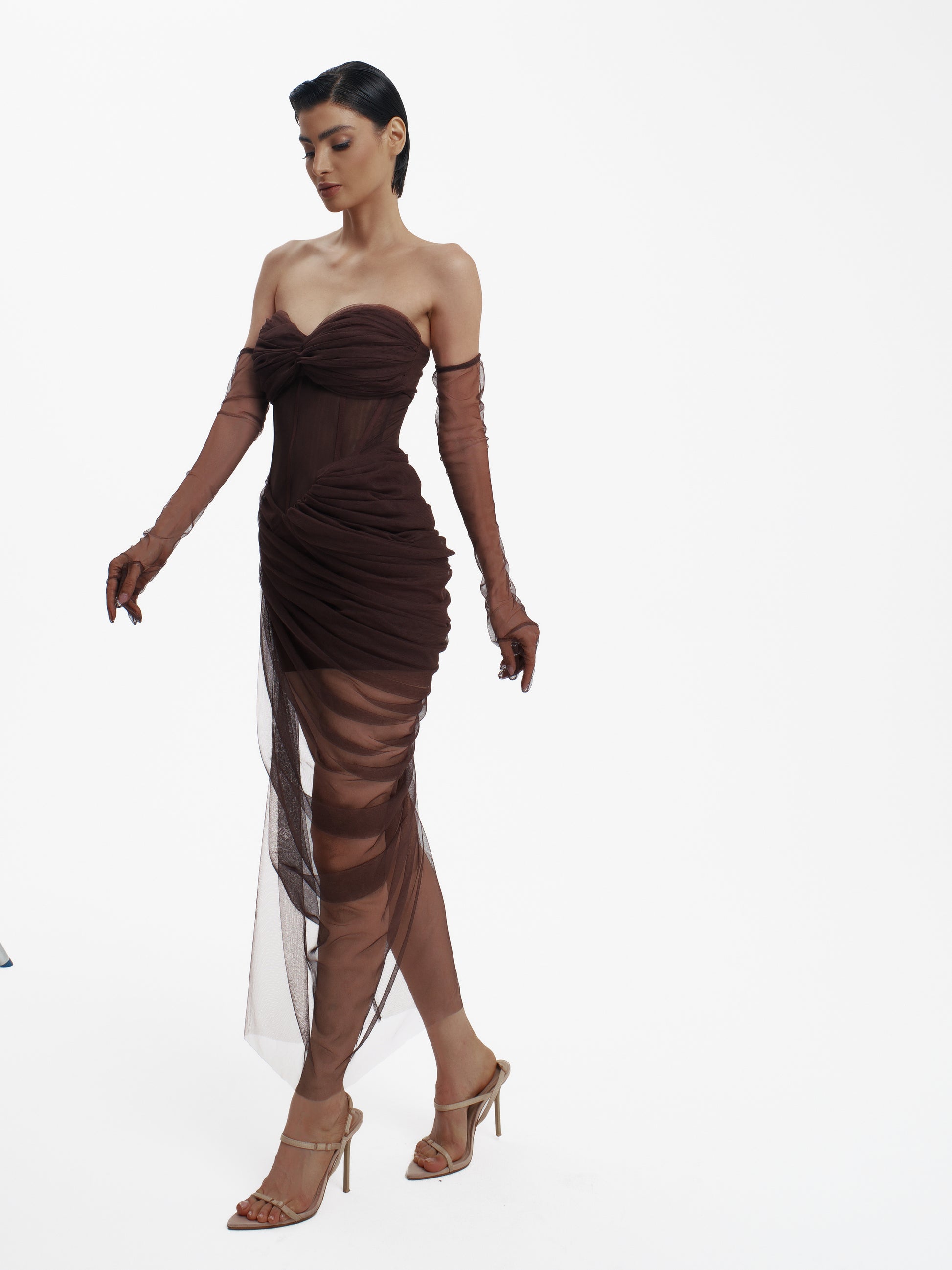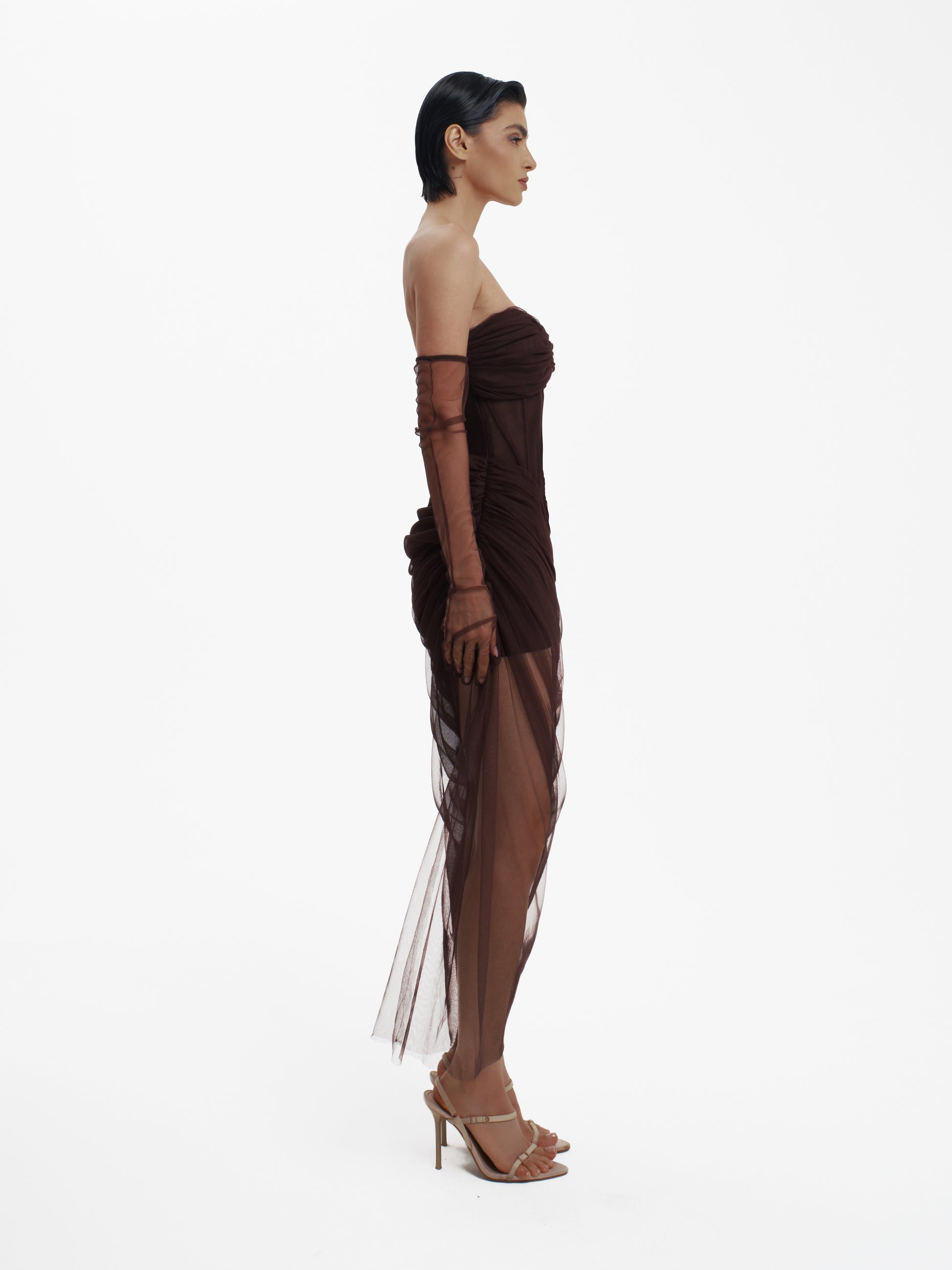 A masterpiece of sensual structure and artful draping, the Meet Me There dress seamlessly blends romance with precision. Designed with a sculpted boned corset base wrapped in layers of soft ruched tulle, this off-shoulder silhouette contours the body like a second skin. Paired with matching opera-length gloves, it radiates timeless glamour with a modern edge.