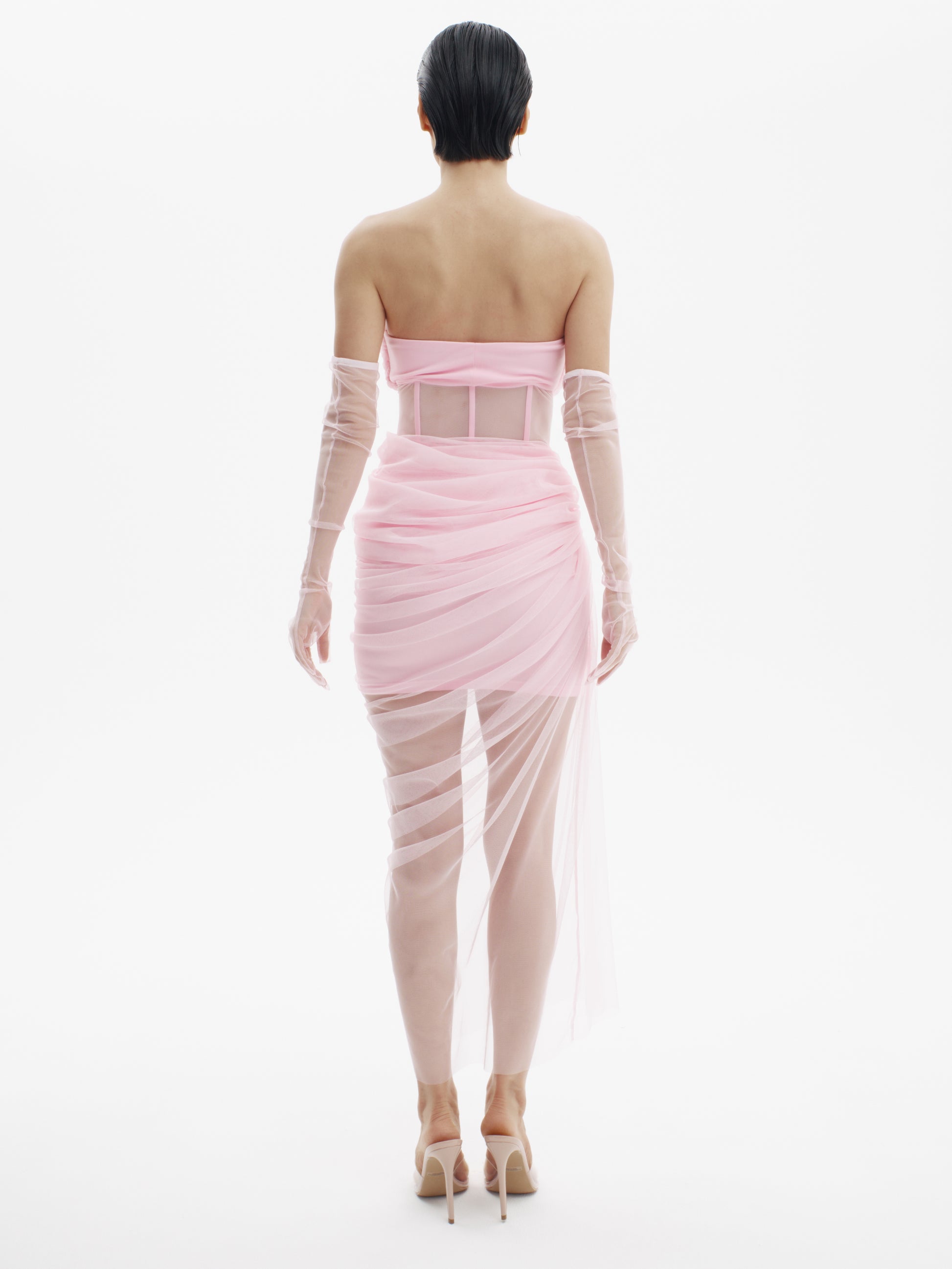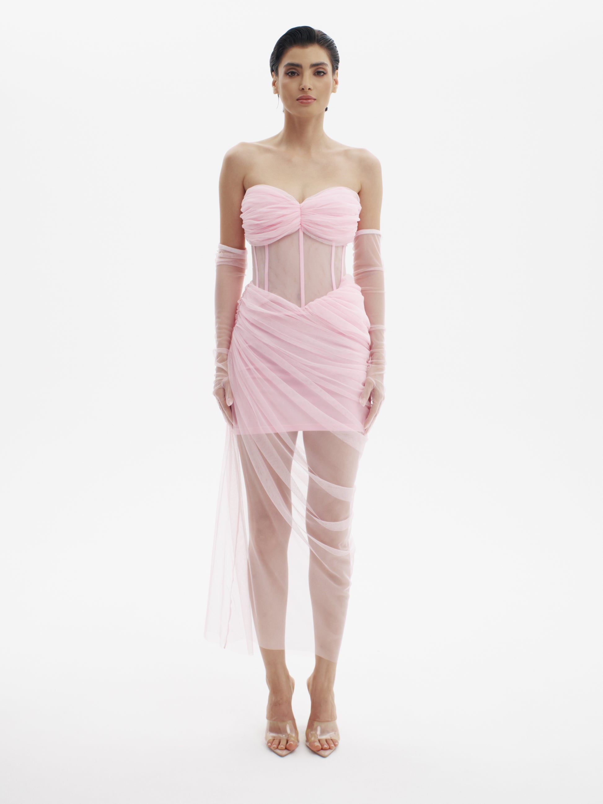 A masterpiece of sensual structure and artful draping, the Meet Me There dress seamlessly blends romance with precision. Designed with a sculpted boned corset base wrapped in layers of soft ruched tulle, this off-shoulder silhouette contours the body like a second skin. Paired with matching opera-length gloves, it radiates timeless glamour with a modern edge.