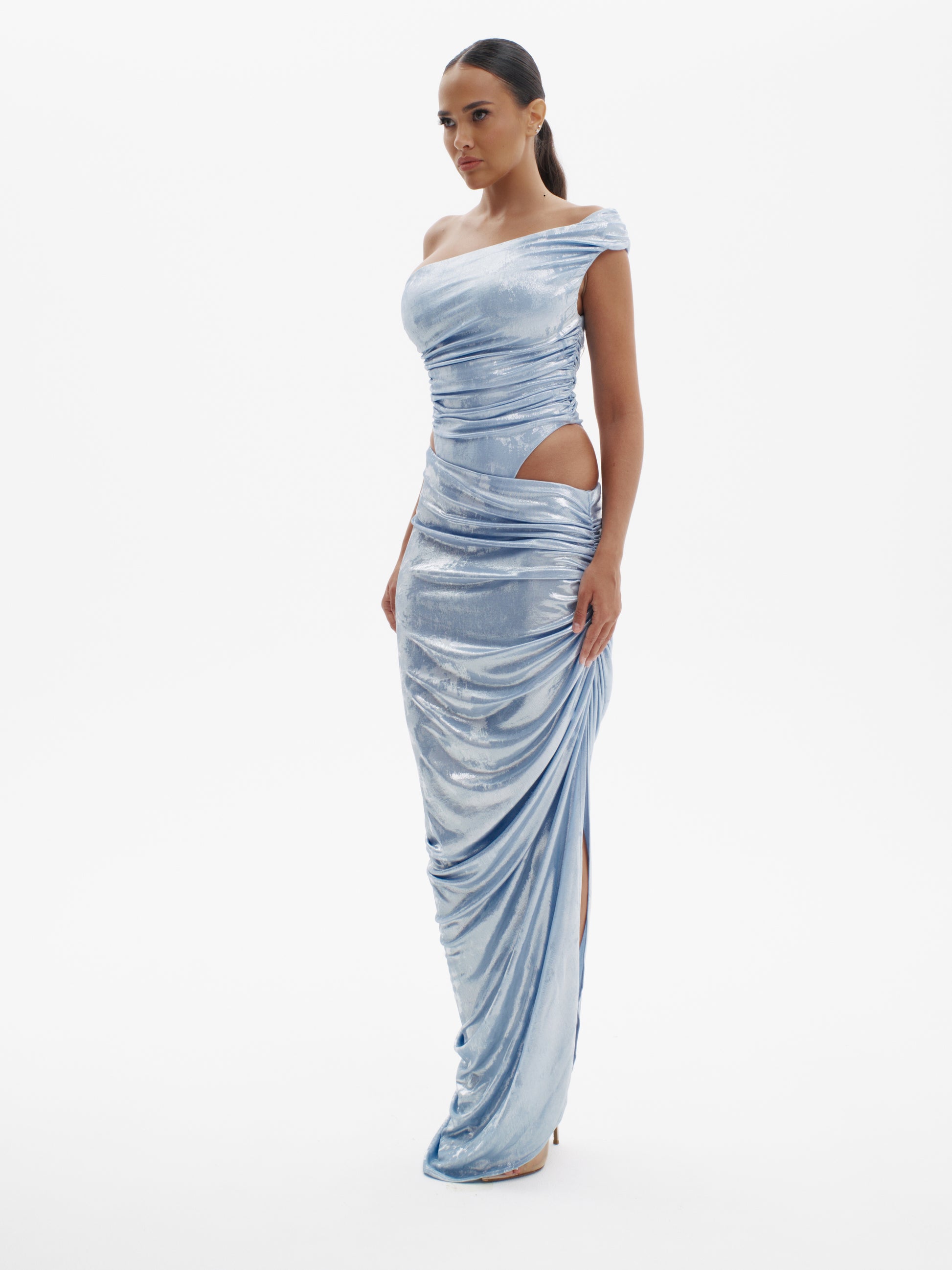 Unapologetically confident and fluidly bold—the Not Sorry Set pairs a sleek sleeveless top with a ruched, asymmetrical skirt for head-turning drama. Designed in shimmering stretch jersey, the thigh-high slit and gathered detailing create a leg-lengthening effect, while the fitted top balances ease and structure. Perfect for evenings that demand extra attitude, whether or not you had permission to be there.