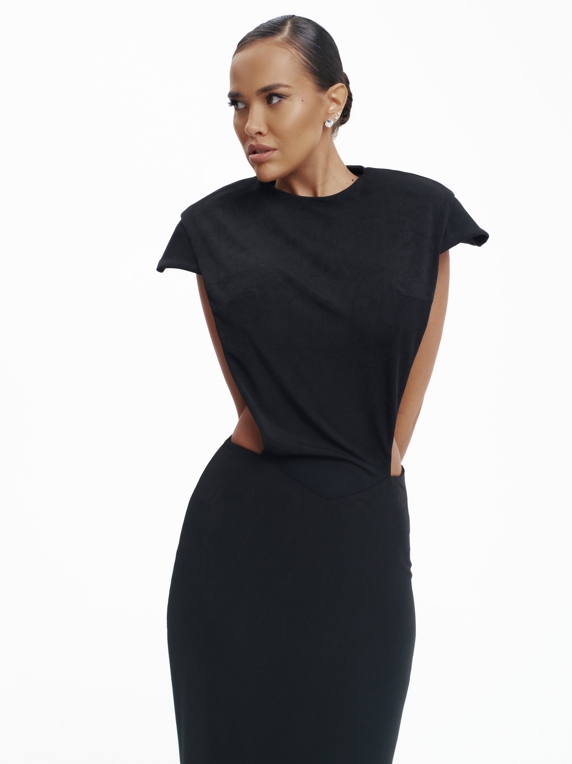 Minimal from the front, daring from the side — the Oops I Slipped dress redefines modern sensuality. Crafted from premium black crepe with a soft suede texture, it features sculpted shoulders and a fluid column silhouette that skims the body effortlessly.