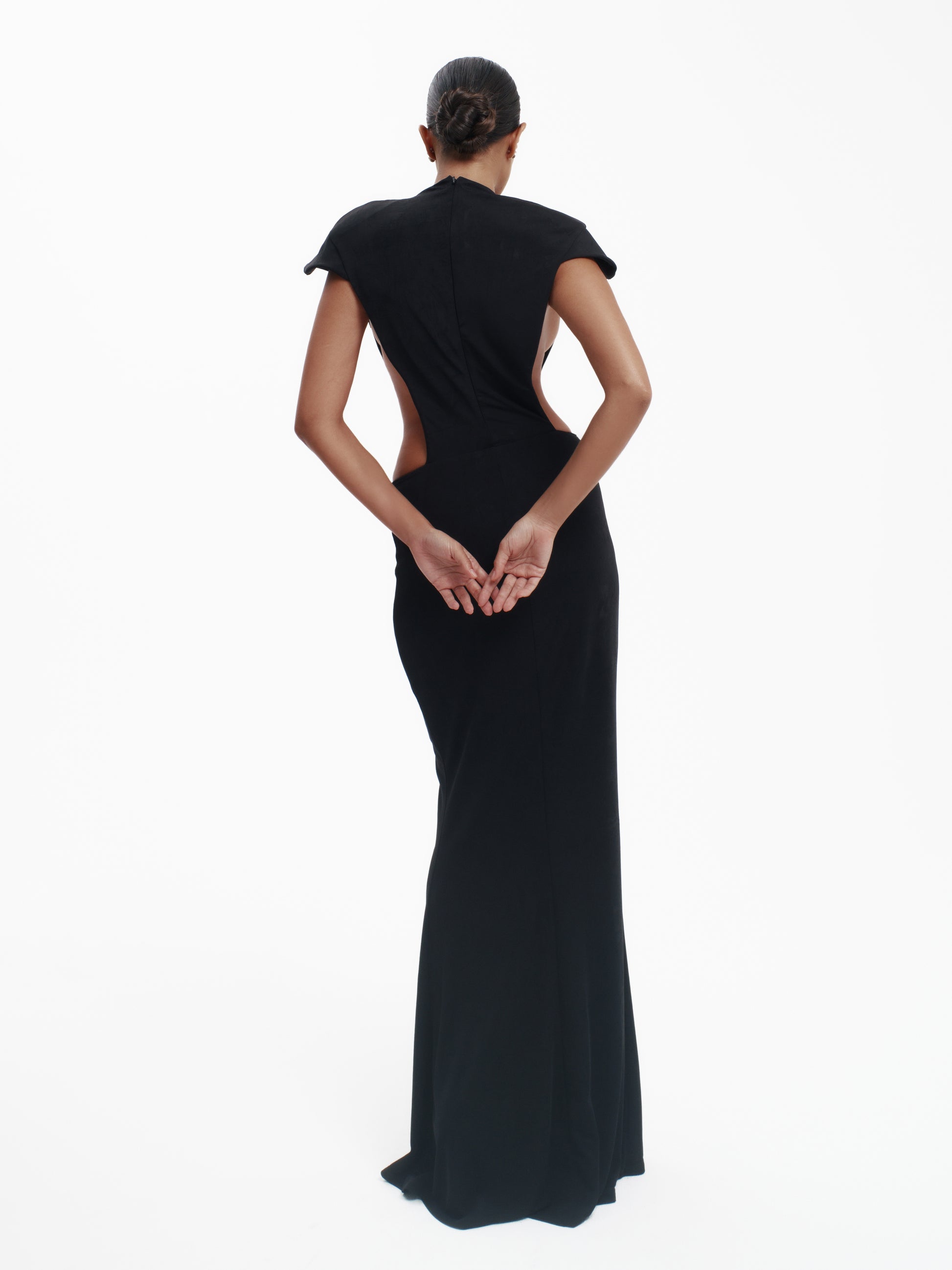 Bold open sides and a backless cut deliver striking impact while maintaining refined elegance. Designed for the fearless woman who leads with presence and finishes with grace.