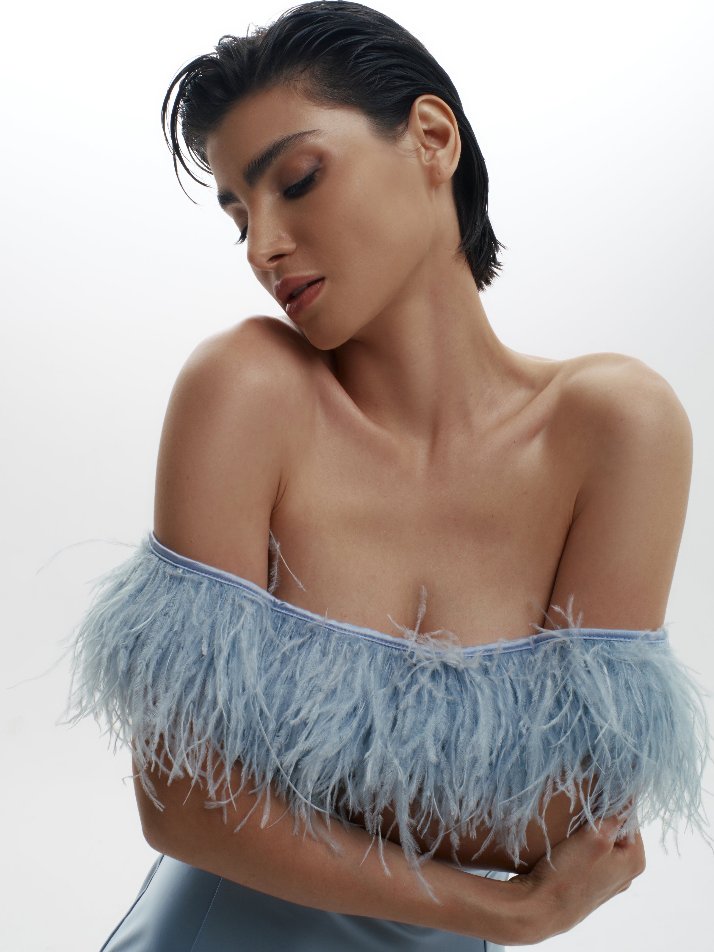 Too fine to explain — Out of This Budget is for the woman who doesn’t wait for permission to shine. Cut in a daring off-shoulder silhouette with natural feathers tracing the neckline, this gown blends bold structure with soft movement. The thigh-high slit elongates the body, while the flowing cotton lamé Lycra drapes like confidence in motion. Available in rich shades of pink, blue, and brown — because some looks simply can’t be afforded.
