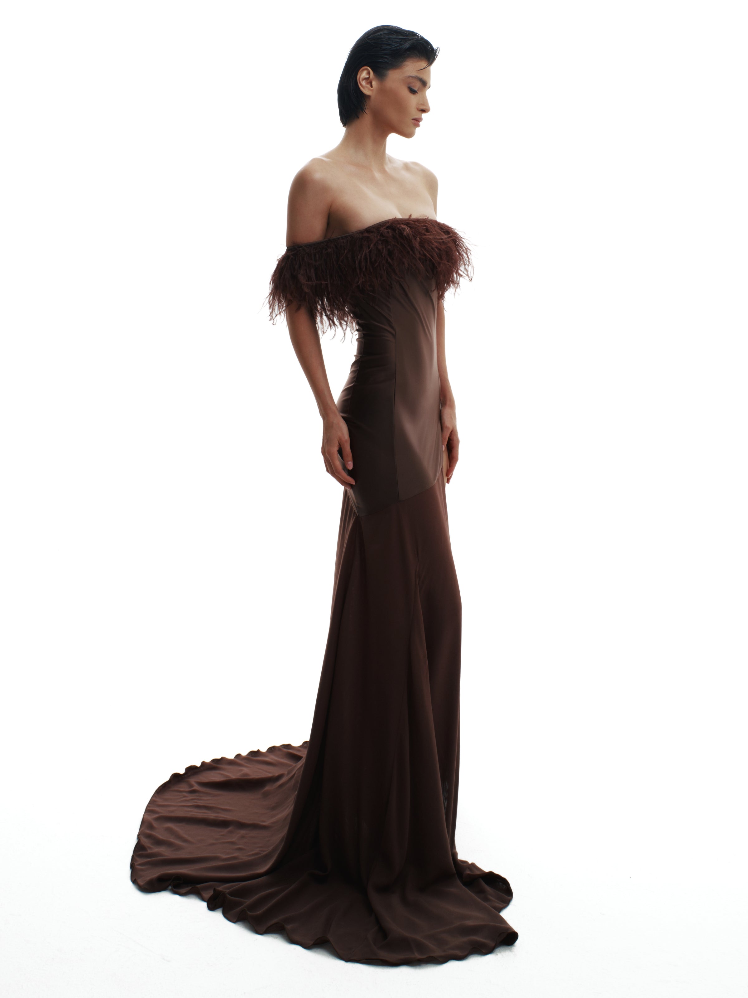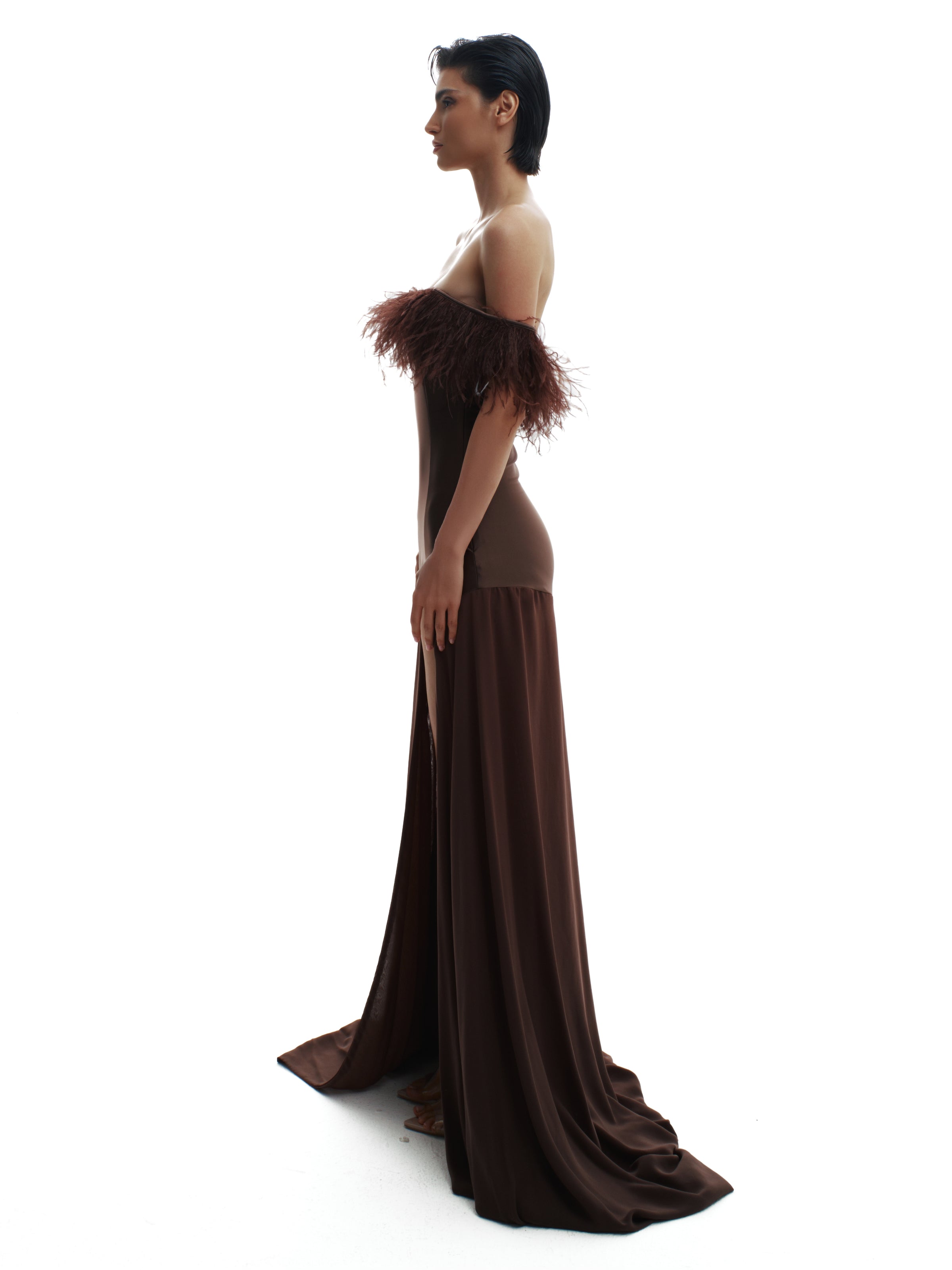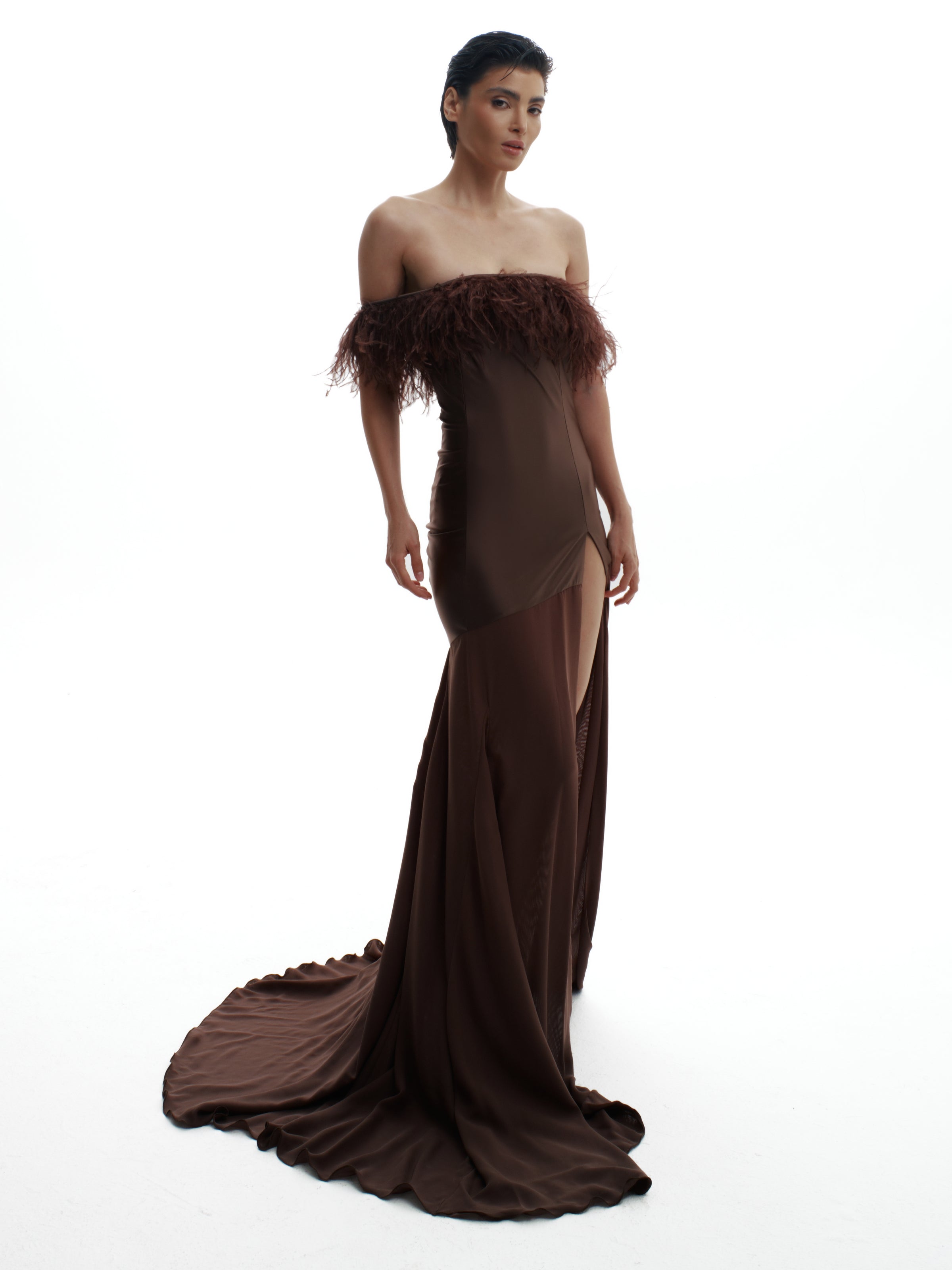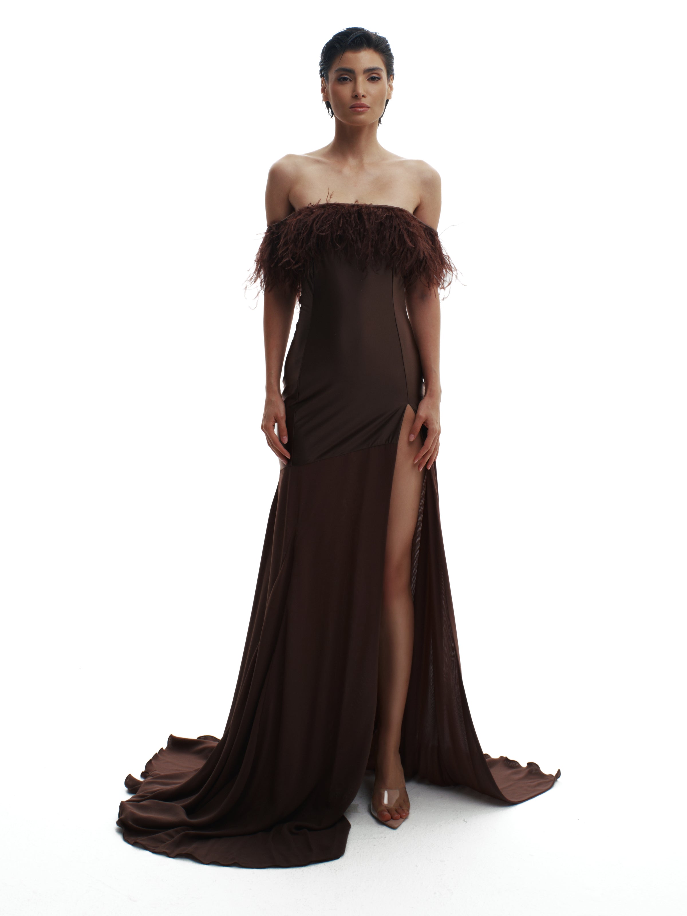 Too fine to explain — Out of This Budget is for the woman who doesn’t wait for permission to shine. Cut in a daring off-shoulder silhouette with natural feathers tracing the neckline, this gown blends bold structure with soft movement. The thigh-high slit elongates the body, while the flowing cotton lamé Lycra drapes like confidence in motion. Available in rich shades of pink, blue, and brown — because some looks simply can’t be afforded.