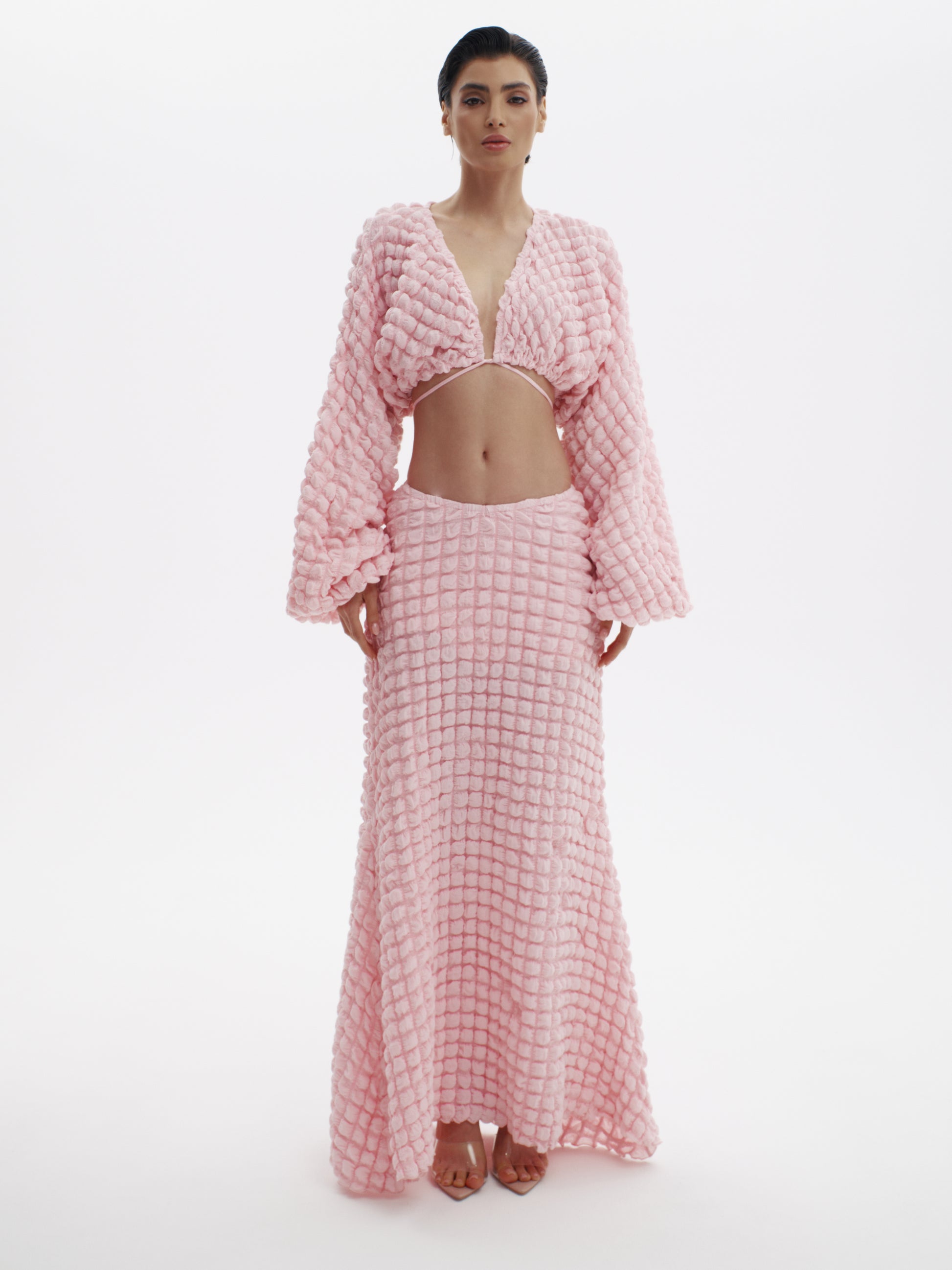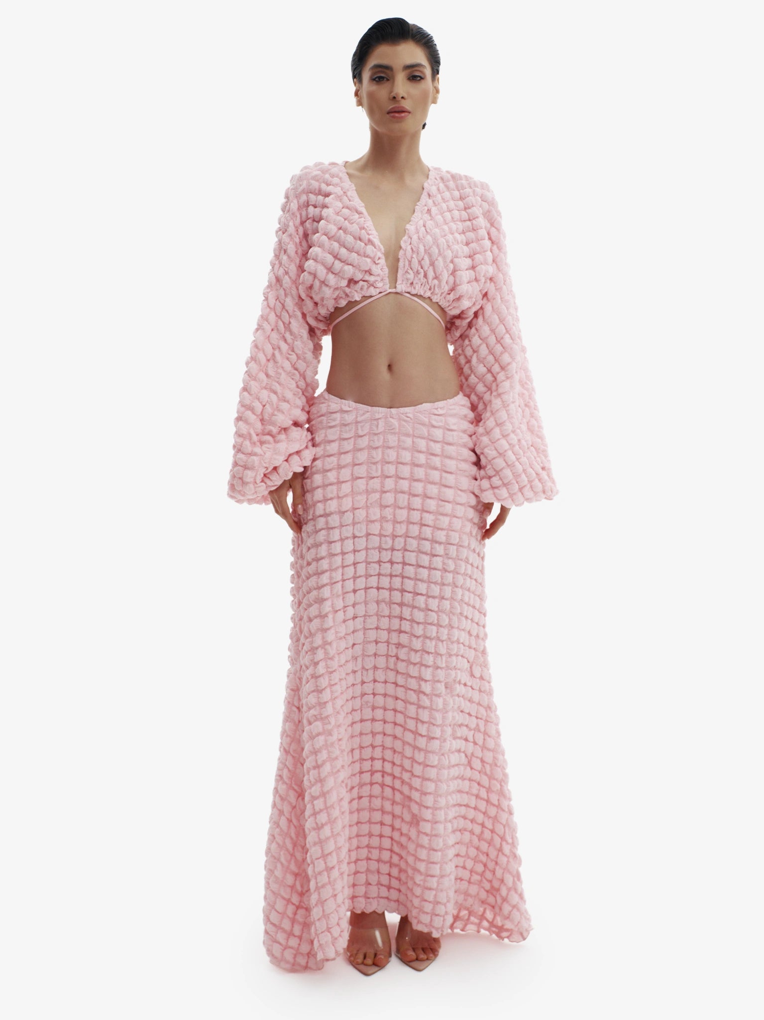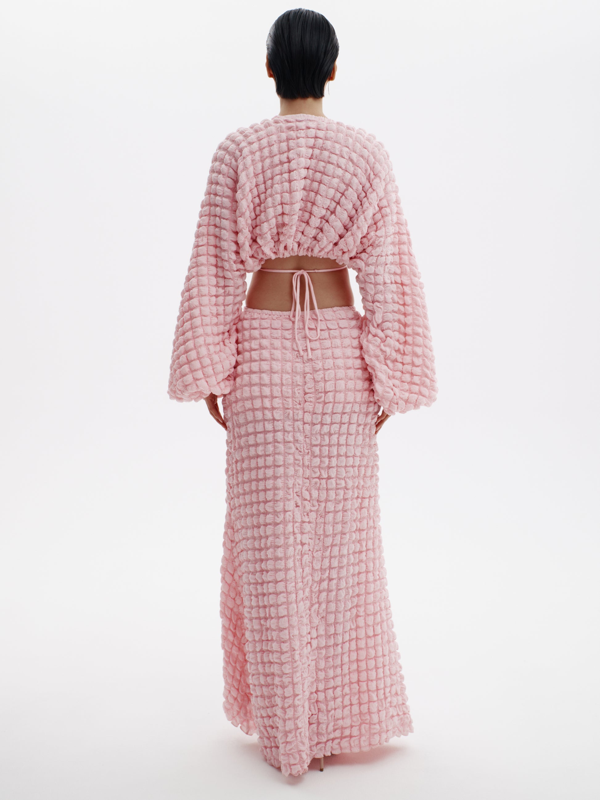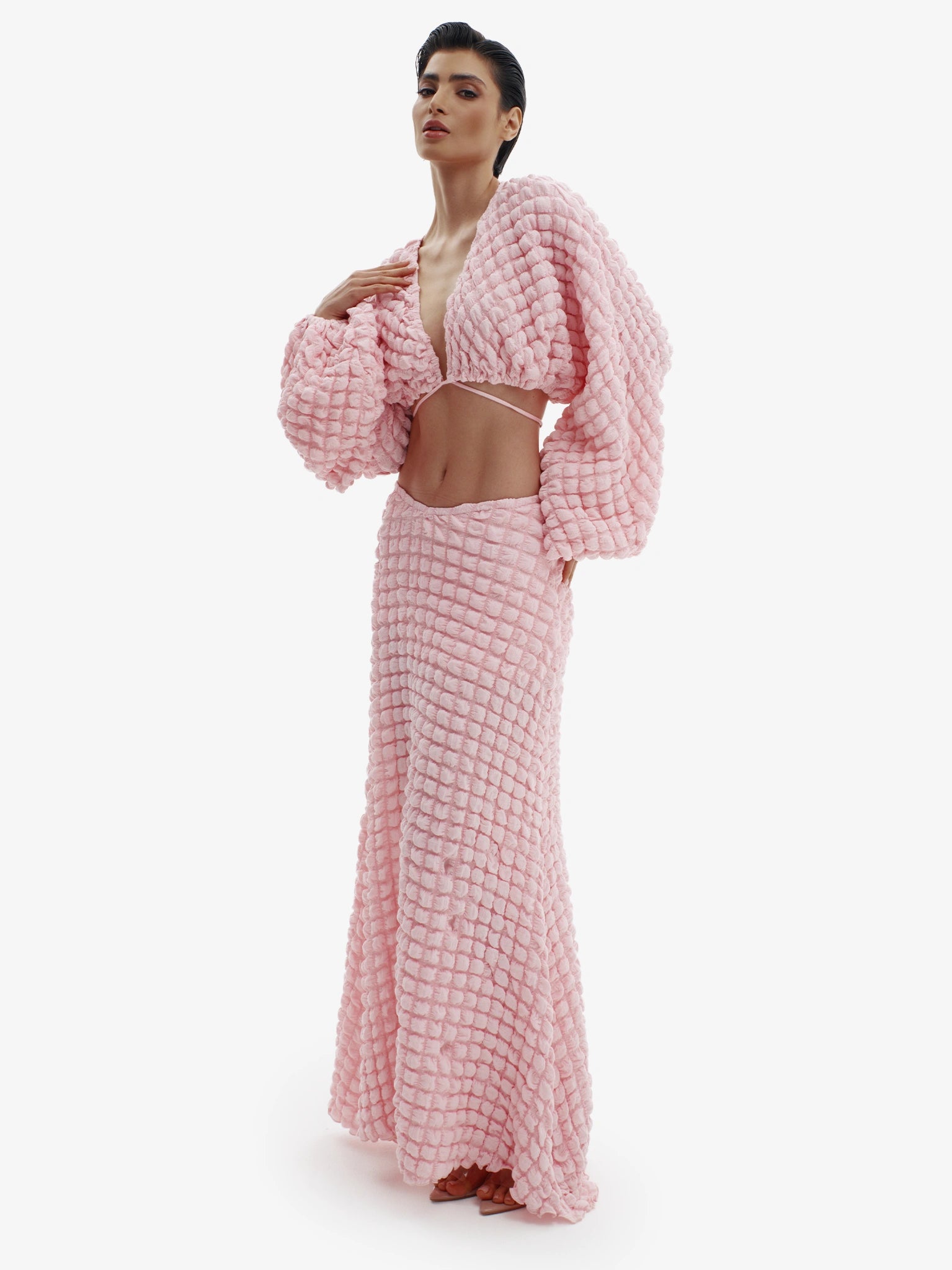 Too chic to just stay in bed—the Pillow Talk Set transforms lounge vibes into a full fashion statement. Crafted from plush, cloud-like 3D textured jacquard, it feels as soft as it looks while delivering standout style. The voluminous balloon-sleeve top with an adjustable tie front pairs effortlessly with the full-length fitted skirt for a silhouette that’s relaxed yet irresistibly flattering. Cozy, breathable, and endlessly versatile, it’s the ultimate set for staying in or stepping out.