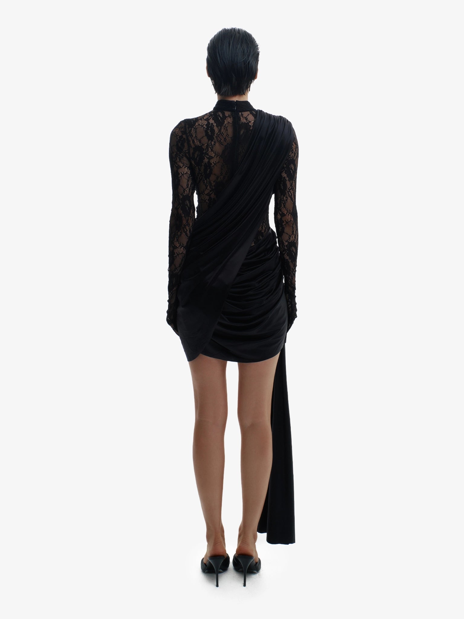 Featuring a high neckline, sleek lace sleeves, and built-in gloves, this piece brings couture drama with a provocative twist. The asymmetrical drape adds bold contrast, creating a silhouette that’s both powerful and unforgettable.