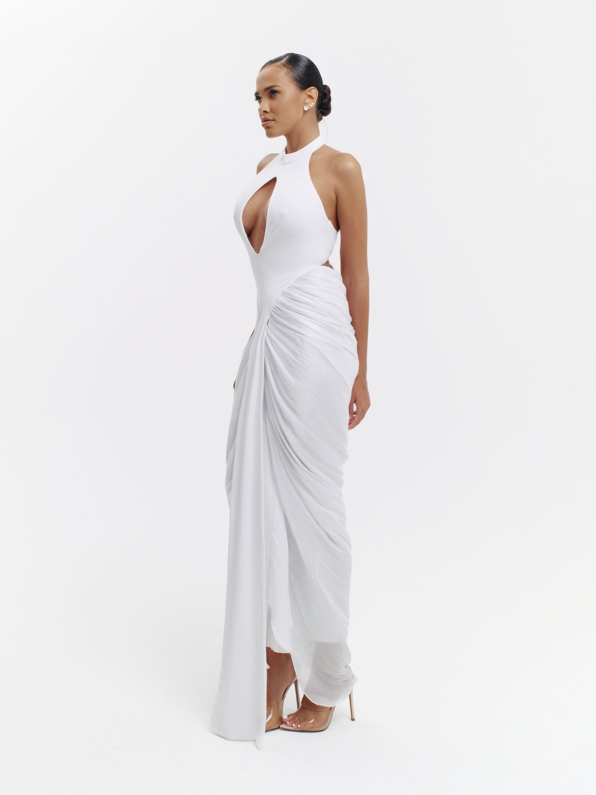 Crafted in smooth, body-contouring stretch with a luminous chiffon skirt, the Split Decision Dress combines a sculpted halter neckline and daring oval cut-out with a body-hugging top and softly ruched, flowing skirt for a look that’s both sleek and effortlessly elegant.