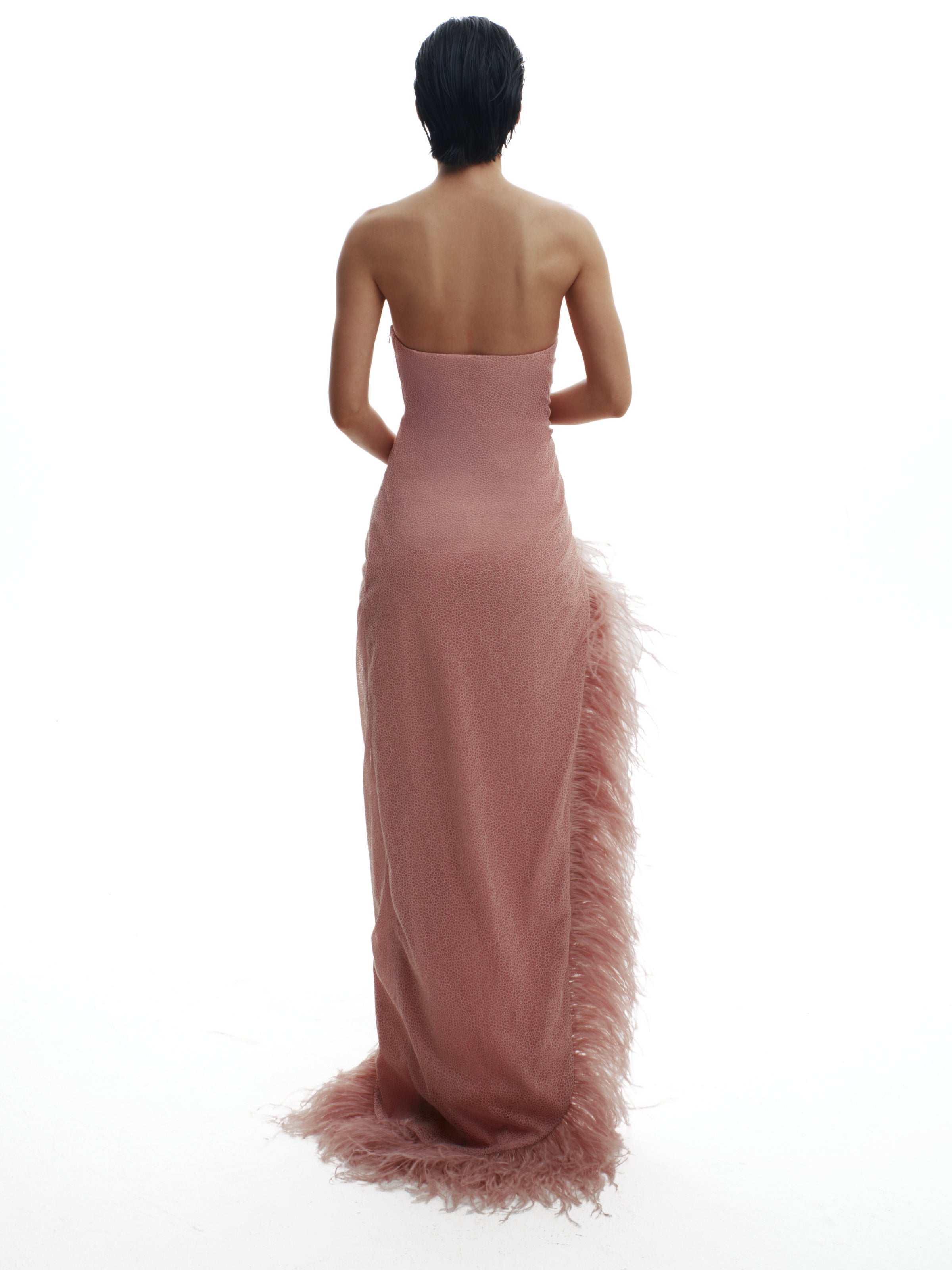 Elegant from afar, unforgettable up close — The Best You Ever Had is designed for the woman who leaves nothing but silence behind. This sleek, feather-slit gown hugs the body in all the right places, blending structure with soft intrigue. Crafted from a luxe cotton-mesh blend with natural feathers tracing the slit, it’s that perfect balance of minimal and magnetic — the kind of dress that doesn’t ask for attention, it owns it.