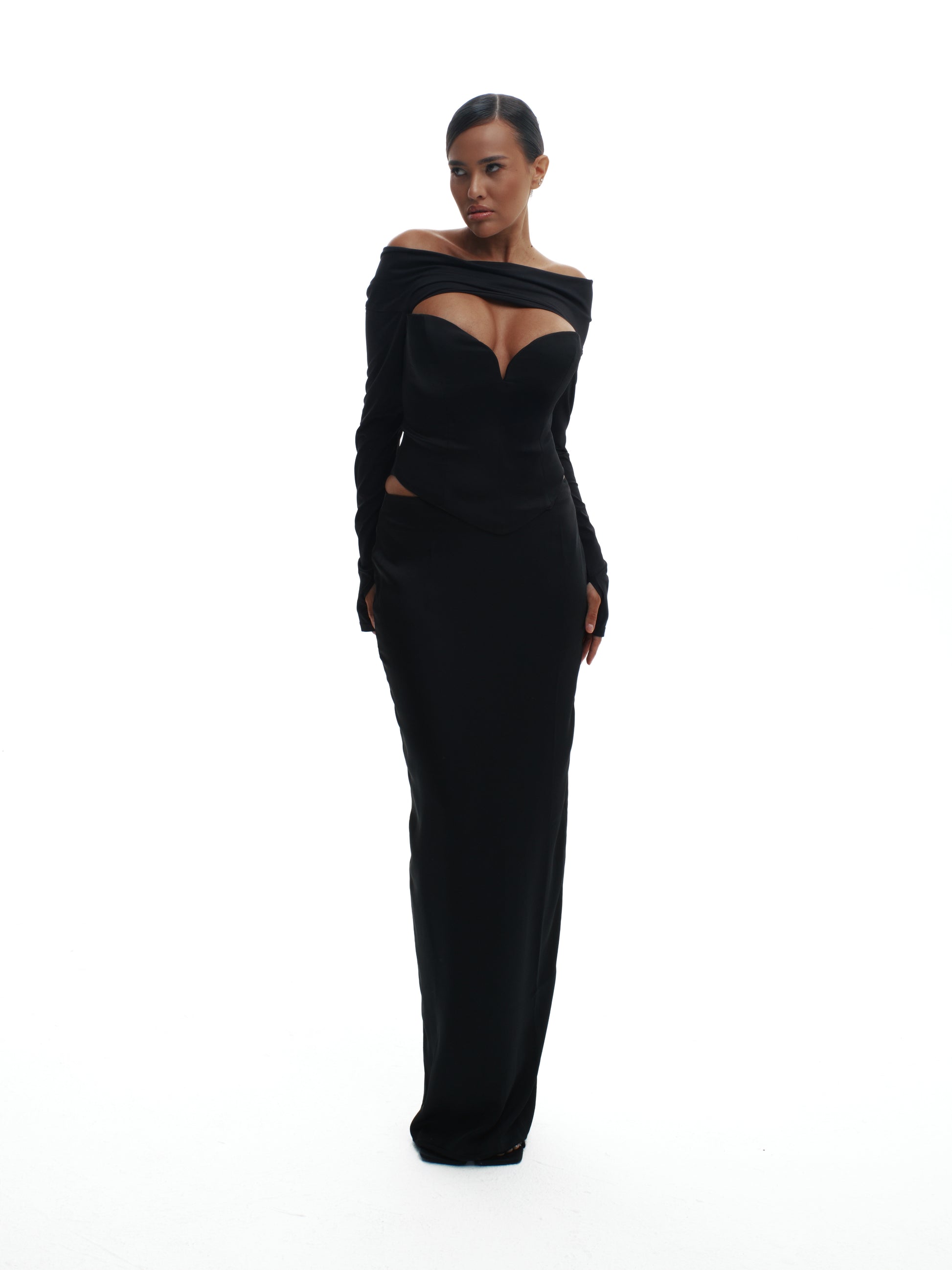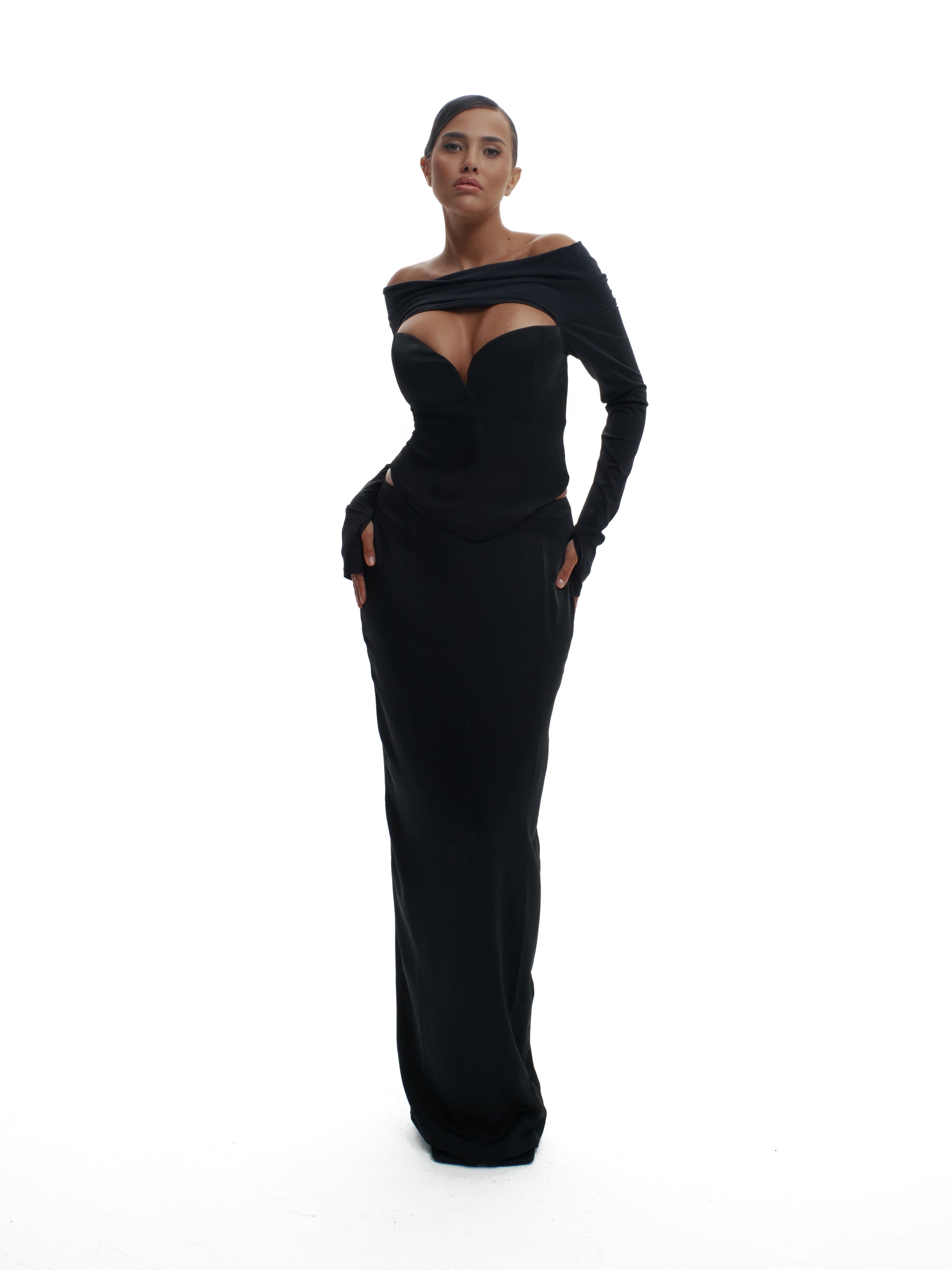 Structured elegance meets flowing ease in the Too Good Together Set—a pairing so perfect it was meant to be. The floor-length Too Much Skirt, cut in fluid crepe fabric, skims the hips and drapes with subtle drama, while the Hold Me Tight Corset Top sculpts the waist with bold side cutouts and a deep V-front. Together, they create a silhouette that hugs, flows, and commands attention in every room.