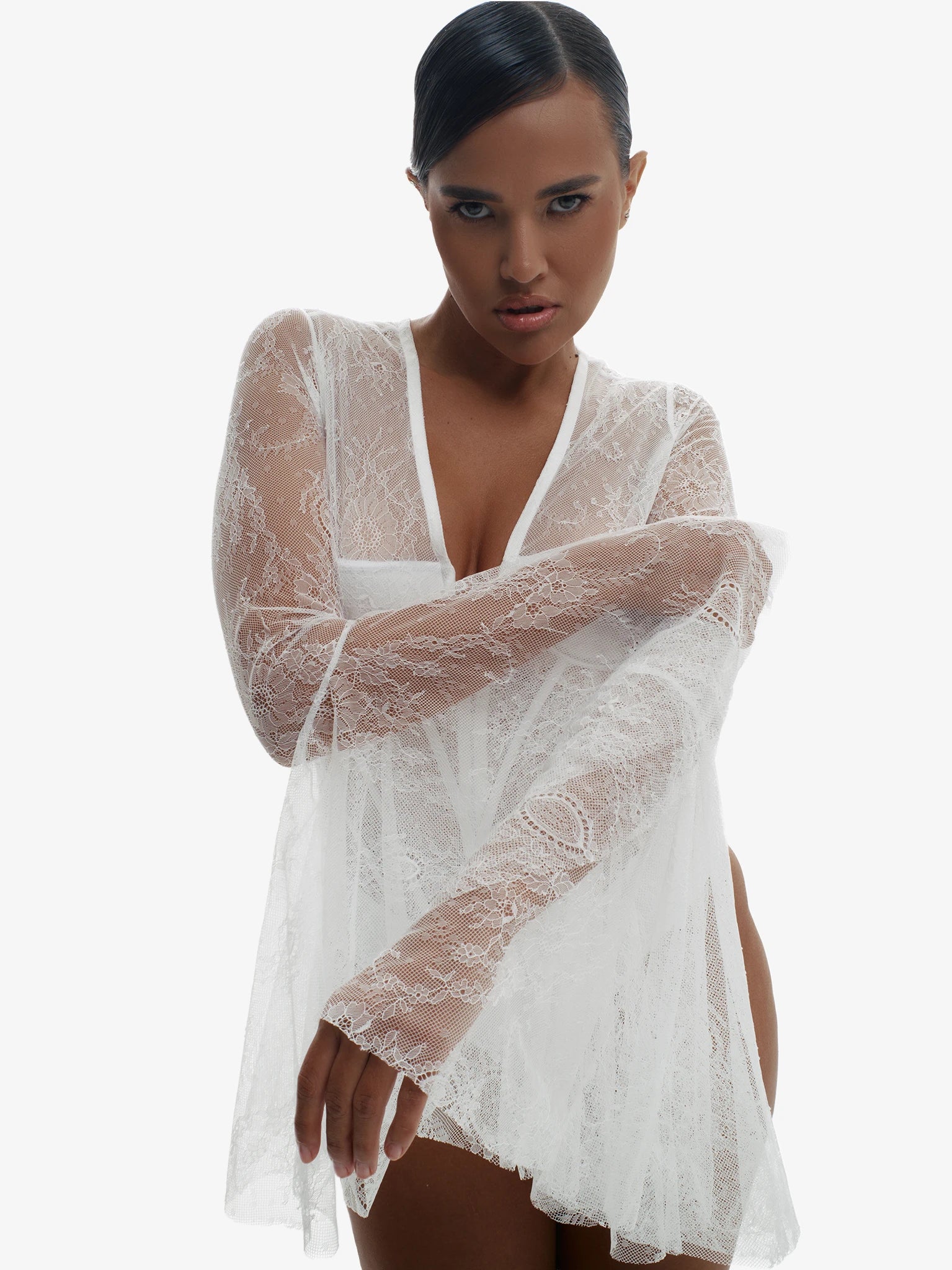 Turn heads in the Touch Me Not bodysuit — a romantic yet daring piece crafted entirely from delicate floral lace. Designed with cascading ruffle sleeves that frame the shoulders, this bodysuit delivers a soft, striking silhouette with feminine flair. The fitted bodice hugs the body for a smooth, flattering finish, while sheer detailing adds just the right amount of allure.