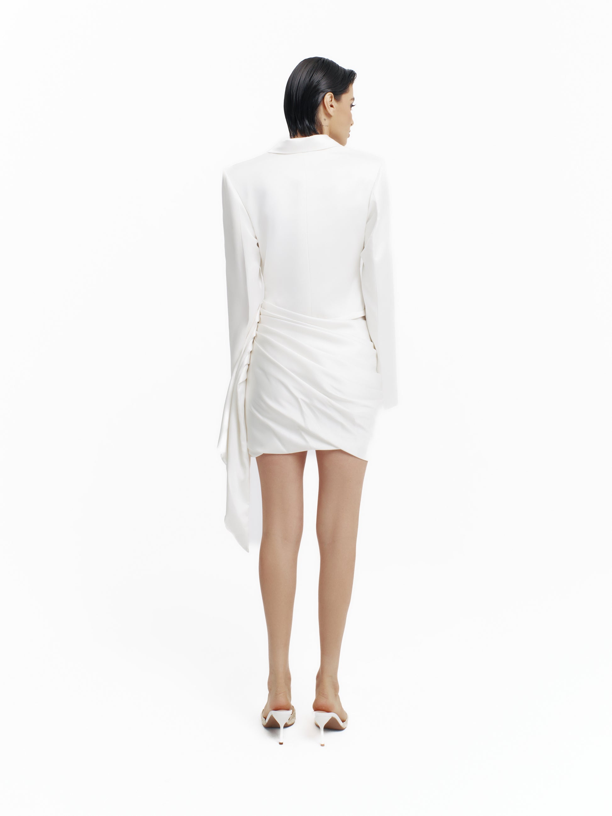 Make a power move in understated style with the Who Invited Her blazer dress. Crafted from luxurious italian stretch satin, this structured mini dress fits like a second skin, sculpting your silhouette with ease. Featuring strong, tailored shoulders and a daring plunging neckline, it’s designed to command attention. Ruched draping flatters the waist and hips, while an asymmetric hem adds unexpected flair.
