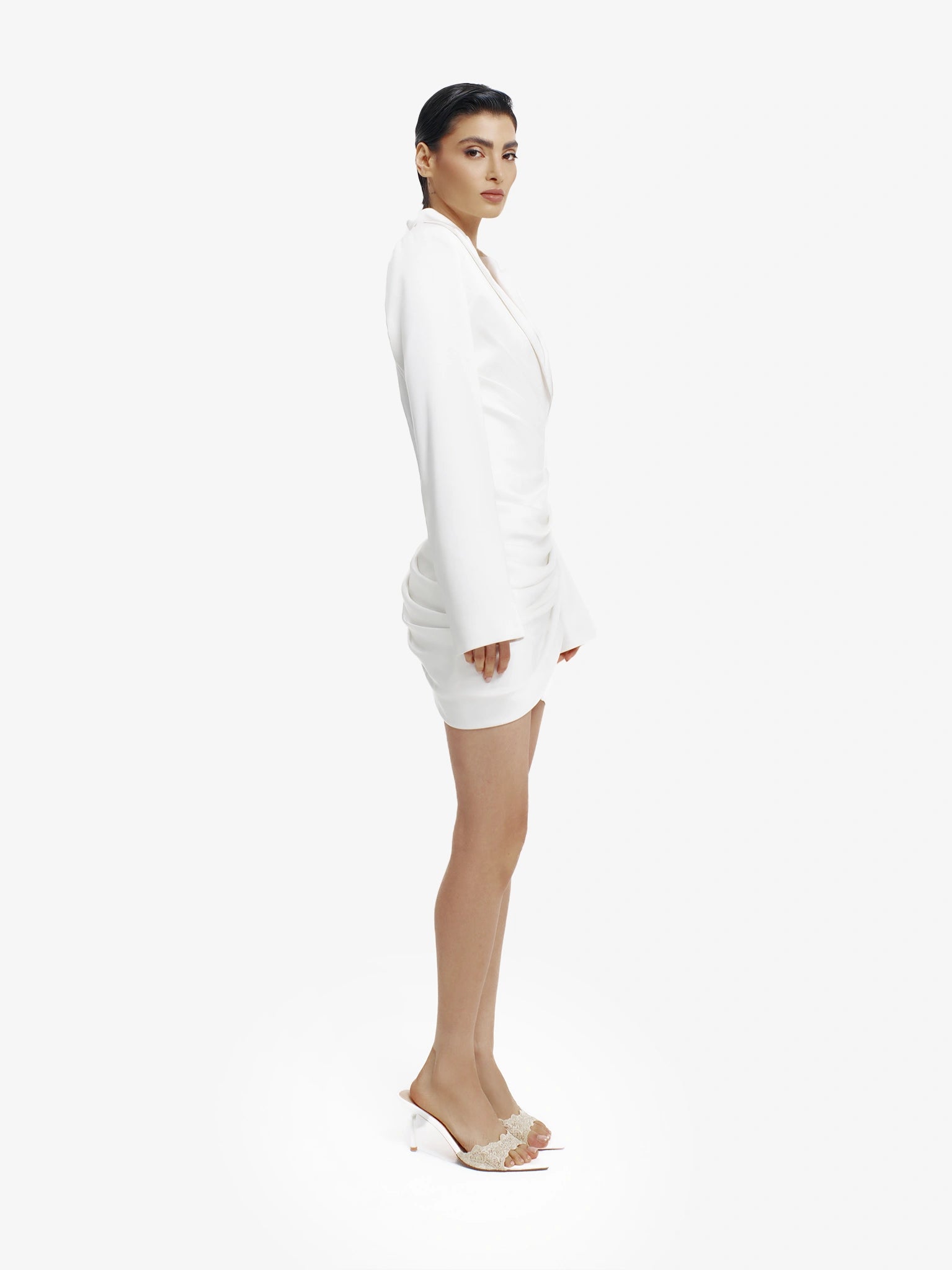 Make a power move in understated style with the Who Invited Her blazer dress. Crafted from luxurious italian stretch satin, this structured mini dress fits like a second skin, sculpting your silhouette with ease. Featuring strong, tailored shoulders and a daring plunging neckline, it’s designed to command attention. Ruched draping flatters the waist and hips, while an asymmetric hem adds unexpected flair.