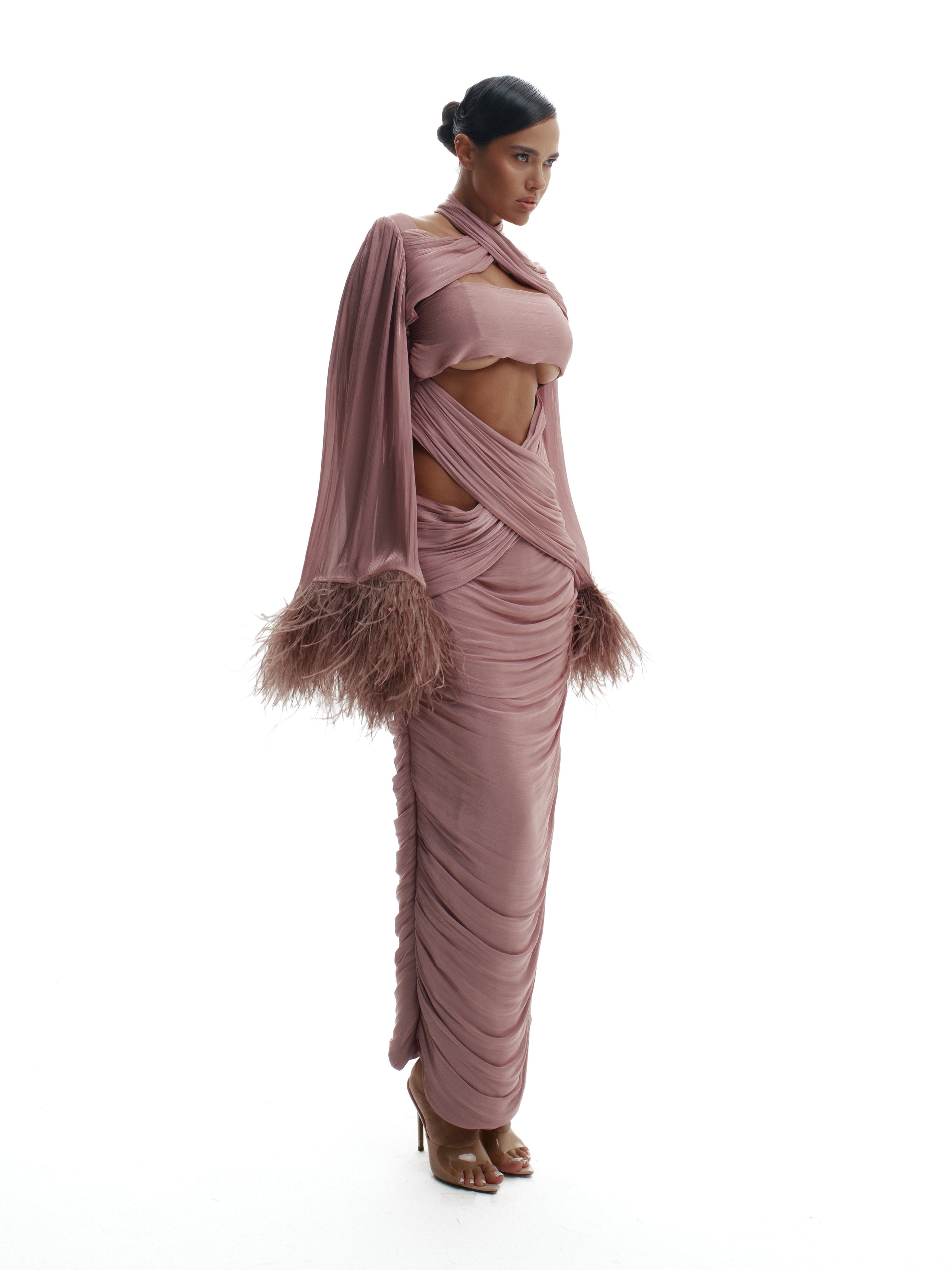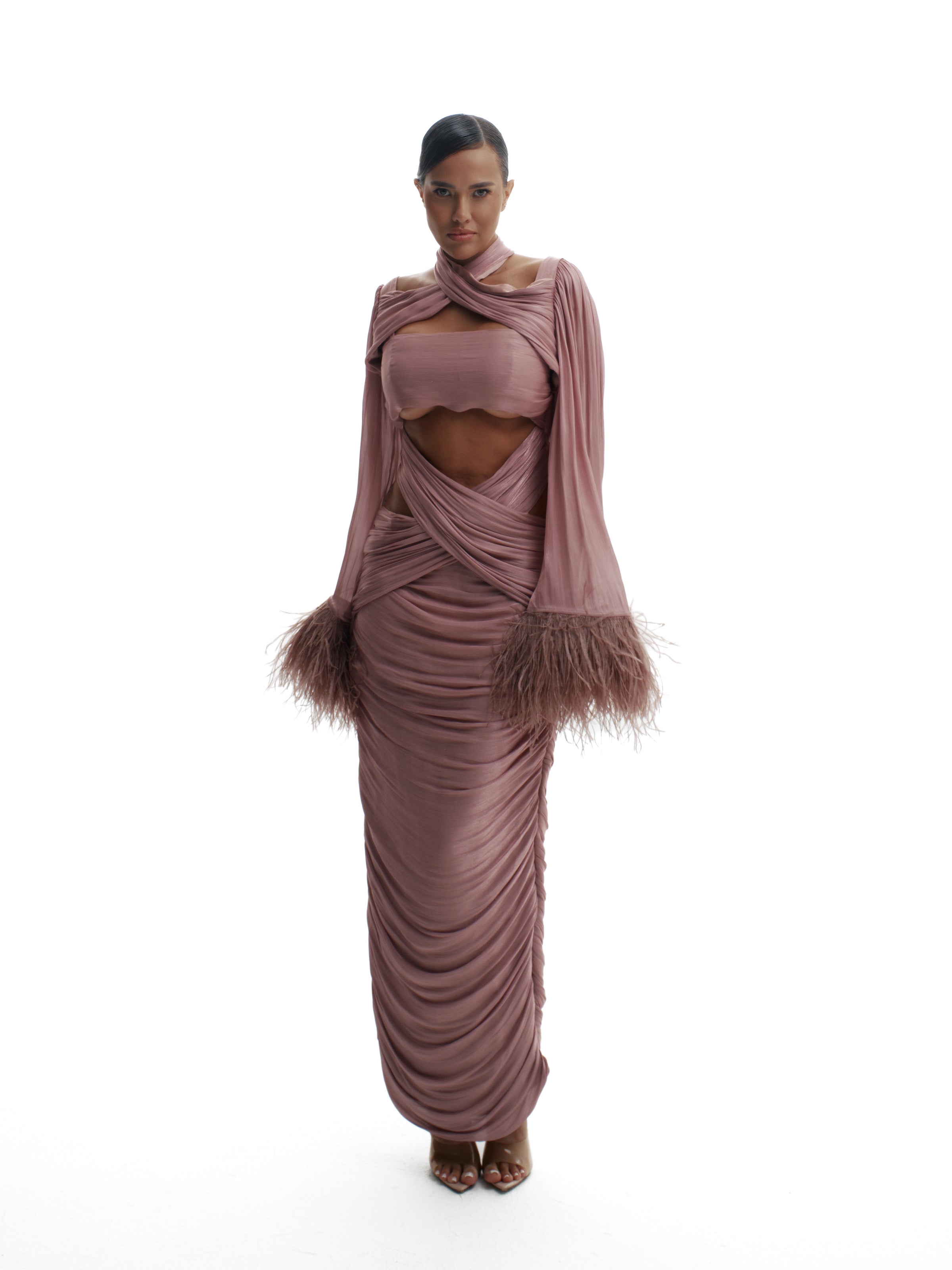 Playful yet dangerously refined — You’ll Regret This is the kind of dress that turns silence into its own language. Crafted in lustrous shiny chiffon with structured cut-outs and feather-trimmed sleeves, its wrap silhouette sculpts the waist and falls fluidly over the body. Every fold, every feather, every glance — designed to make him remember what confidence looks like.